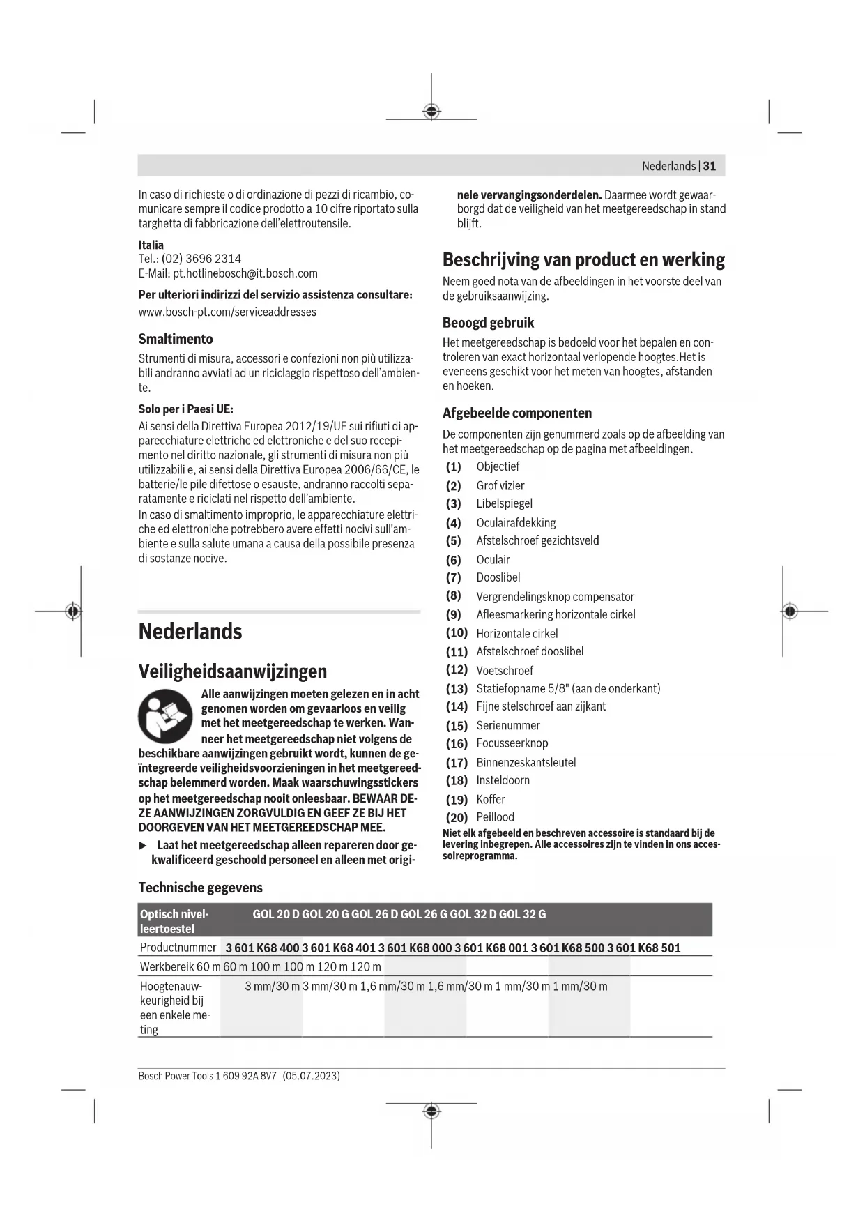 (9) (9) (10) (10) Richt het meetgereedschap op punt A. Draai de horizontale cirkel(10) met het nulpunt naar de afleesmarkering(9). Richt het meetgereedschap dan op punt B. Lees de hoek op de afleesmarkering(9) af. GOL20D/GOL26D/GOL32D: in het voorbeeld gemeten hoek: 45°. GOL20G/GOL26G/GOL32G: in het voorbeeld gemeten hoek: 45gon. Nauwkeurigheidscontrole van het meetgereedschap Controleer de nivelleer- en aanduidingsnauwkeurigheid van het meetgereedschap telkens vóór aanvang van het werk en na een langer transport van het meetgereedschap. Dooslibel controleren Lijn het meetgereedschap met behulp van de voetschroeven(12) zodanig uit dat de luchtbel zich in het centrum van de dooslibel(7) bevindt. Draai de verrekijker 180°. Als de luchtbel zich niet meer in het centrum van de dooslibel(7) bevindt, moet de dooslibel worden bijgesteld. Bosch Power Tools 1 609 92A 8V7 | (05.07.2023)34 | Nederlands Dooslibel bijstellen Breng de luchtbel van de dooslibel(7) door draaien aan de voetschroeven(12) in een posi- tie in het midden tussen de eindpositie van het controleproces en het centrum. (17) (11) Draai met behulp van de binnenzeskantsleutel(17) aan de afstelschroeven(11) tot de luchtbel zich in het centrum van de dooslibel bevindt. Controleer de dooslibel door de verrekijker 180° te draaien. Herhaal de afstelprocedure indien nodig of neem eventueel contact op met de klantendienst van Bosch. Compensator controleren Meet na het uitlijnen en focusseren van het meetgereed- schap de hoogte bij een referentiepunt. Druk dan op de vergrendelingsknop(8) van de compensator en laat deze weer los. Meet opnieuw de hoogte bij het referentiepunt. Als de twee hoogtes niet precies overeenkomen, laat dan het meetgereedschap repareren door een klantendienst van Bosch. Dradenkruis controleren Voor de controle heeft u een meetafstand van ca. 30m lang nodig. Plaats het meetgereedschap in het midden en de ni- velleerlatten A en B aan beide uiteinden van het meettraject. A B 30 m