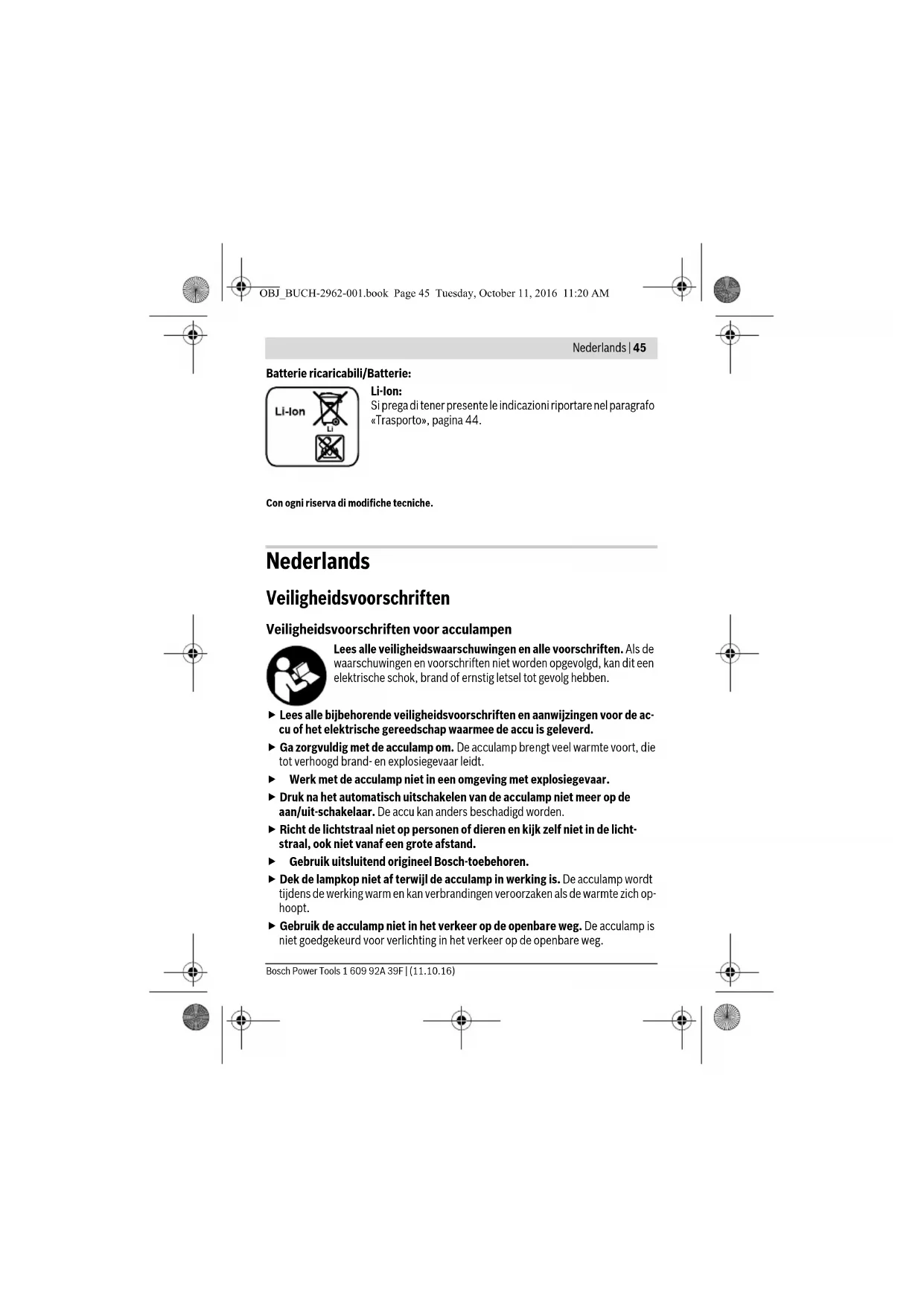 - Niet elk afgebeeld en beschreven toebehoren wordt standaard meegeleverd. Het volledige toebehoren vindt u in ons toebehorenprogramma. Technische gegevens Montage Accu opladen (toebehoren) Opmerking: De accu wordt gedeeltelijk opgeladen geleverd. Om de volledige capaci- teit van de accu te verkrijgen, laadt u voor het eerste gebruik de accu volledig in het oplaadapparaat op. Acculamp GLI 12V-300 Productnummer 3 601 DA1 0.. Nominale spanning V= 12 Brandduur, ca. min/Ah 180 Gewicht volgens EPTA-Procedure 01:2014 kg 0,32 –0,52* Lichtstroom lm 300 Toegestane omgevingstemperatuur –bij het laden –bij het gebruik** en bij opslag