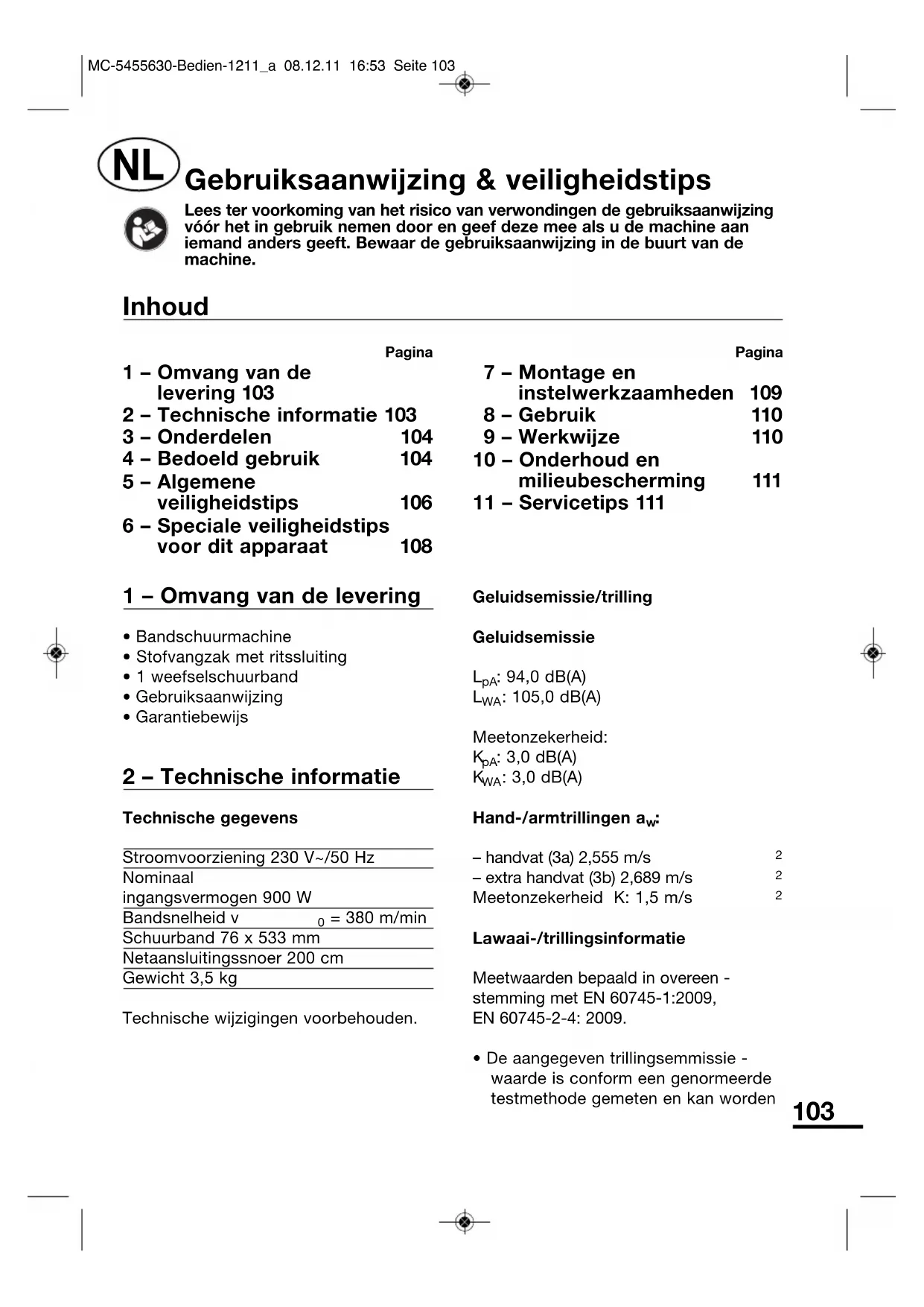| 4 – Bedoeld gebruik | 104 | 10 – Onderhoud en milieubescherming | 111 |