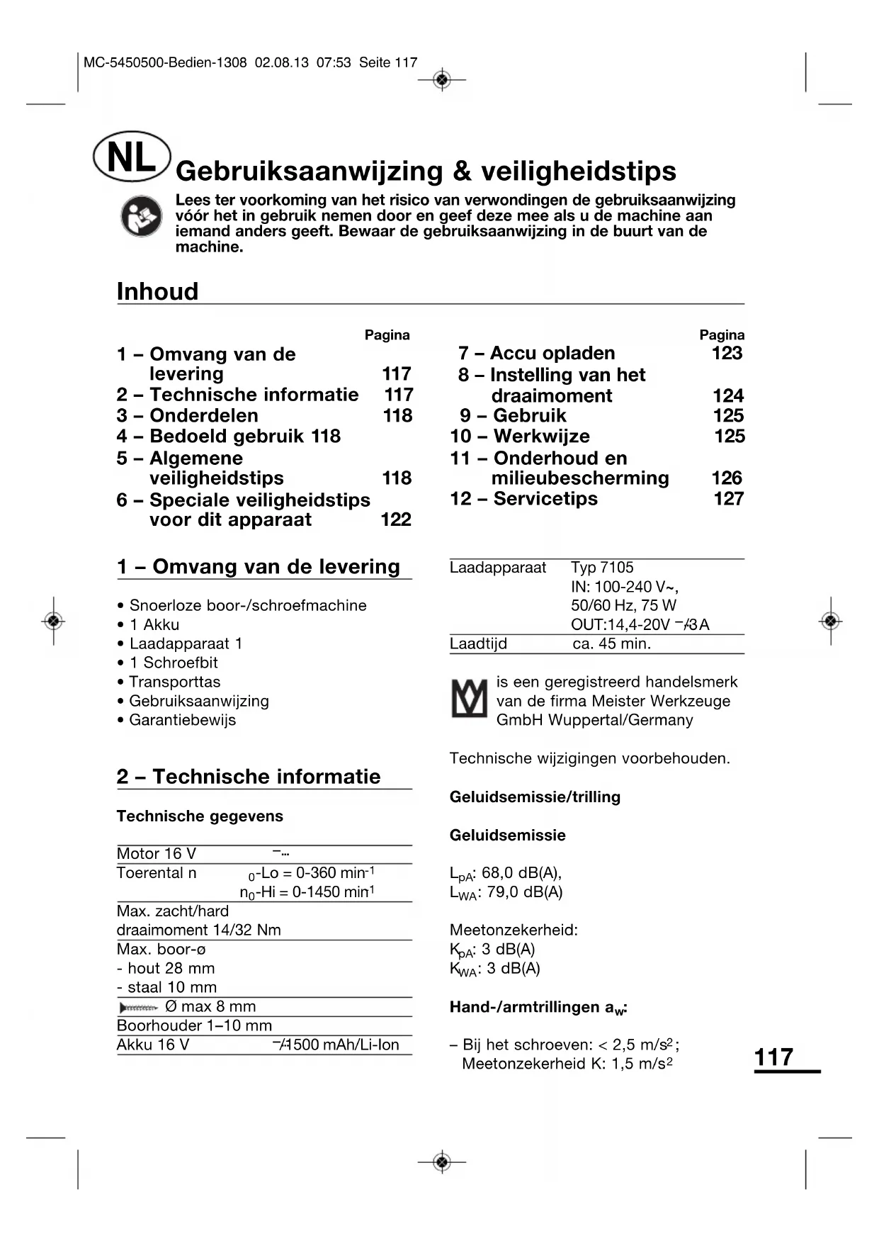 BELANGRIJK! Wij wijten eruitdrukkelijk op, dat wij volgens de wet op de productaansprakelijk heid Niet voor door once apparaten veroorzaakte schade op hoeven te komen, voor zover deze door ondeskundige reparatie veroorzaakt of bij een verrangen van onderdelen Niet once originele onderdelen of door ons goedgekeurde onderdelen gezruikt werden en de reparatie Niet door de klantenservice van Meister Werk zeuge GmbH of een geauthoriseerdevakmanuitgevoerd ward! Dit geldt ook voor de gebruekte accessoires.