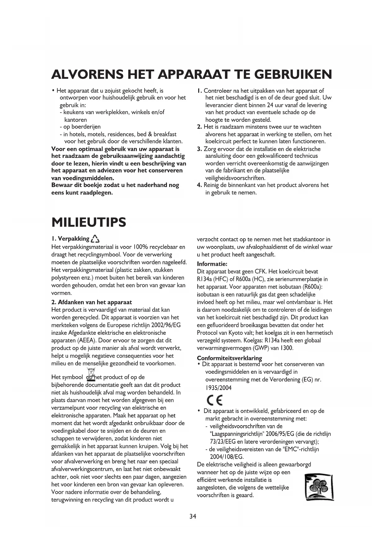 - Dit apparaat is bestemd voor het conserveren van voedingsmiddelen en is vervaardigd in overeenstemming met de Verordening (EG) nr. 1935/2004