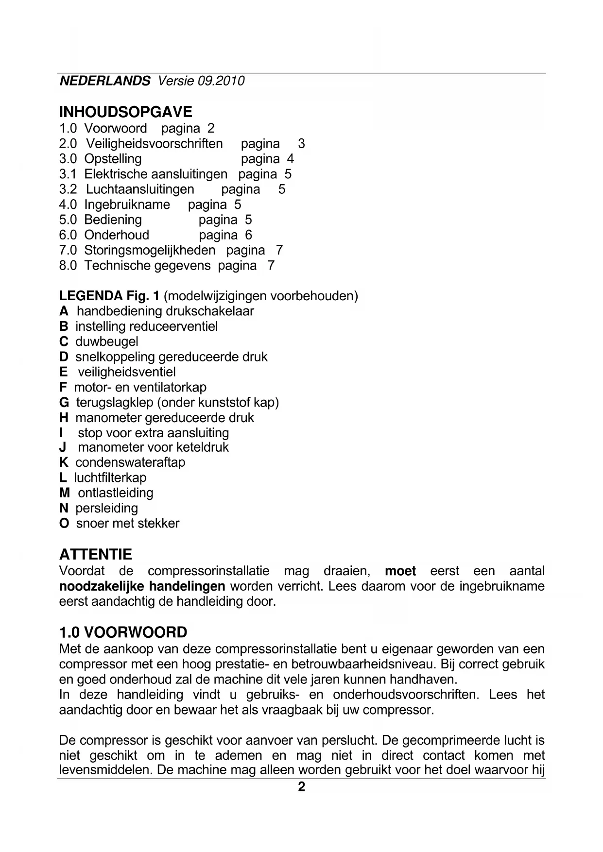 LEGENDA Fig. 1 (modelwijzigingen voorbehouden) A handbediening drukschakelaar B instelling reduceerventiel C duwbeugel D snelkoppeling gereduceerde druk E veiligheidsventiel F motor- en ventilatorkap G terugslagklep (onder kunststof kap) H manometer gereduceerde druk I stop voor extra aansluiting J manometer voor keteldruk K condenswateraftap L luchtfilterkap M ontlastleiding N persleiding O snoer met stekker ATTENTIE Voordat de compressorinstallatie mag draaien, moet eerst een aantal noodzakelijke handelingen worden verricht. Lees daarom voor de ingebruikname eerst aandachtig de handleiding door.