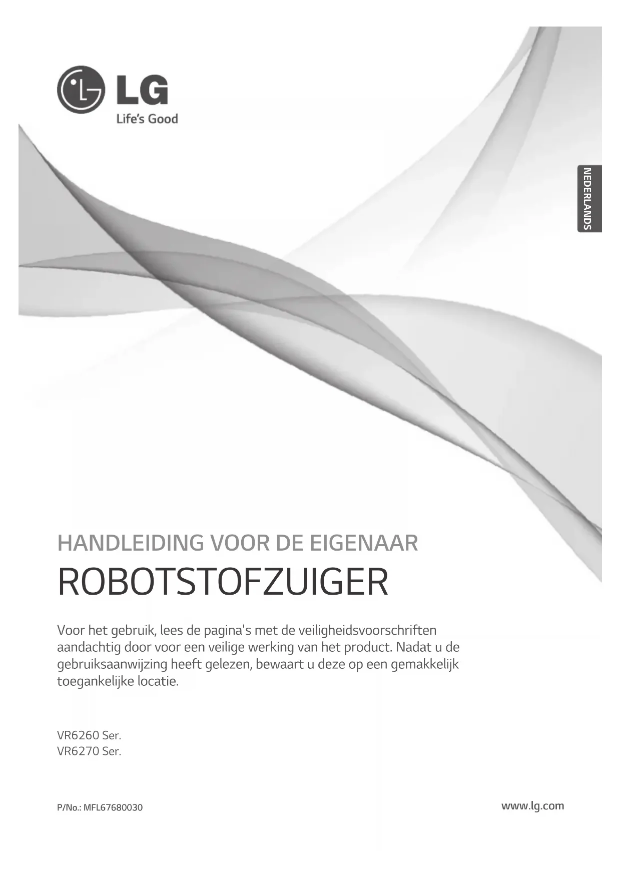 ROBOTSTOFZUIGER VR6260 Ser. VR6270 Ser. Voor het gebruik, lees de pagina's met de veiligheidsvoorschriften aandachtig door voor een veilige werking van het product. Nadat u de gebruiksaanwijzing heeft gelezen, bewaart u deze op een gemakkelijk toegankelijke locatie. www.lg.com P/No.: MFL67680030 NEDERLANDSFUNCTIES Hoekreiniging Door de aanwending van een gloednieuw conceptontwerp dat geschikt is voor wanden, is het reinigend vermogen van de Robot Cleaner uiterst doelmatig. De stand 'Learning' (leren) De Robot Cleaner is in staat om de reinigingsomgeving te onthouden door middel van de leermodus voor slimmere reiniging. Stand Turbo In de stand "Turbo" reinigt de robotstofzuiger krachtiger waarmee een schoner resultaat wordt verkregen. Indien geselecteerd, wordt de stand "Turbo" automatisch ingeschakeld op tapijten, zodat de robotstofzuiger doelmatiger kan reinigen. Handgreep dweilhouder Met de "Handgreep dweilhouder" kunnen gebruikers gemakkelijker de dweil vervangen zonder het apparaat om te hoeven draaien. Mijn ruimte-modes Als u de robotstofzuiger opdraagt een bepaalde ruimte te reinigen, reinigt deze snel de gewenste ruimte. Stofzuigen herhalen De robotstofzuiger reinigt continu totdat de batterij leeg is. Locatiezoekfunctie Wanneer de robotstofzuiger tijdens de werking van een plek wordt verplaatst, zal het apparaat automatisch zoeken naar de vorige locatie en terugkeren naar de plek waar het werd onderbroken. ZigzagNEDERLANDS INHOUD Veiligheidsmaatregelen Meegeleverd met product Beschrijving van de onderdelen Functies van de knoppen Informatie over de display-status Voordat u begint Overzicht