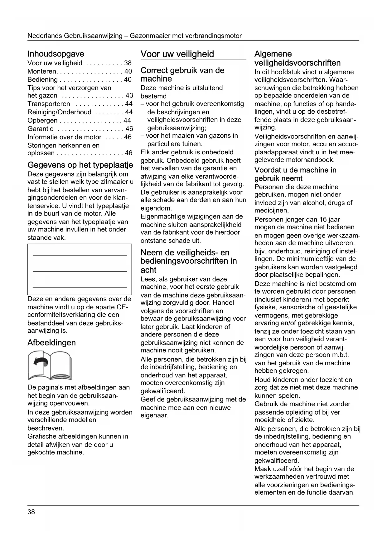 - Storingen herkennen en oplossen Gegevens op het typeplaatje Deze gegevens zijn belangrijk om vast te stellen welk type zitmaaier u hebt bij het bestellen van vervan- gingsonderdelen en voor de klan- tenservice. U vindt het typeplaatje in de buurt van de motor. Alle gegevens van het typeplaatje van uw machine invullen in het onder- staande vak. Deze en andere gegevens over de machine vindt u op de aparte CE- conformiteitsverklaring die een bestanddeel van deze gebruiks- aanwijzing is. Afbeeldingen De pagina's met afbeeldingen aan het begin van de gebruiksaan- wijzing openvouwen. In deze gebruiksaanwijzing worden verschillende modellen beschreven. Grafische afbeeldingen kunnen in detail afwijken van de door u gekochte machine. Voor uw veiligheid Correct gebruik van de machine Deze machine is uitsluitend bestemd – voor het gebruik overeenkomstig de beschrijvingen en veiligheidsvoorschriften in deze gebruiksaanwijzing; – voor het maaien van gazons in particuliere tuinen. Elk ander gebruik is onbedoeld gebruik. Onbedoeld gebruik heeft het vervallen van de garantie en afwijzing van elke verantwoorde- lijkheid van de fabrikant tot gevolg. De gebruiker is aansprakelijk voor alle schade aan derden en aan hun eigendom. Eigenmachtige wijzigingen aan de machine sluiten aansprakelijkheid van de fabrikant voor de hierdoor ontstane schade uit. Neem de veiligheids- en bedieningsvoorschriften in acht Lees, als gebruiker van deze machine, voor het eerste gebruik van de machine deze gebruiksaan- wijzing zorgvuldig door. Handel volgens de voorschriften en bewaar de gebruiksaanwijzing voor later gebruik. Laat kinderen of andere personen die deze gebruiksaanwijzing niet kennen de machine nooit gebruiken. Alle personen, die betrokken zijn bij de inbedrijfstelling, bediening en onderhoud van het apparaat, moeten overeenkomstig zijn gekwalificeerd. Geef de gebruiksaanwijzing met de machine mee aan een nieuwe eigenaar. Algemene veiligheidsvoorschriften In dit hoofdstuk vindt u algemene veiligheidsvoorschriften. Waar- schuwingen die betrekking hebben op bepaalde onderdelen van de machine, op functies of op hande- lingen, vindt u op de desbetref- fende plaats in deze gebruiksaan- wijzing. Veiligheidsvoorschriften en aanwij- zingen voor motor, accu en accuo- plaadapparaat vindt u in het mee- geleverde motorhandboek. Voordat u de machine in gebruik neemt Personen die deze machine gebruiken, mogen niet onder invloed zijn van alcohol, drugs of medicijnen. Personen jonger dan 16 jaar mogen de machine niet bedienen en mogen geen overige werkzaam- heden aan de machine uitvoeren, bijv. onderhoud, reiniging of instel- lingen. De minimumleeftijd van de gebruikers kan worden vastgelegd door plaatselijke bepalingen. Deze machine is niet bestemd om te worden gebruikt door personen (inclusief kinderen) met beperkt fysieke, sensorische of geestelijke vermogens, met gebrekkige ervaring en/of gebrekkige kennis, tenzij ze onder toezicht staan van een voor hun veiligheid verant- woordelijke persoon of aanwij- zingen van deze persoon m.b.t. van het gebruik van de machine hebben gekregen. Houd kinderen onder toezicht en zorg dat ze niet met deze machine kunnen spelen. Gebruik de machine niet zonder passende opleiding of bij ver- moeidheid of ziekte. Alle personen, die betrokken zijn bij de inbedrijfstelling, bediening en onderhoud van het apparaat, moeten overeenkomstig zijn gekwalificeerd. Maak uzelf vóór het begin van de werkzaamheden vertrouwd met alle voorzieningen en bedienings- elementen en de functie daarvan.Gebruiksaanwijzing – Gazonmaaier met verbrandingsmotor Nederlands p. 46