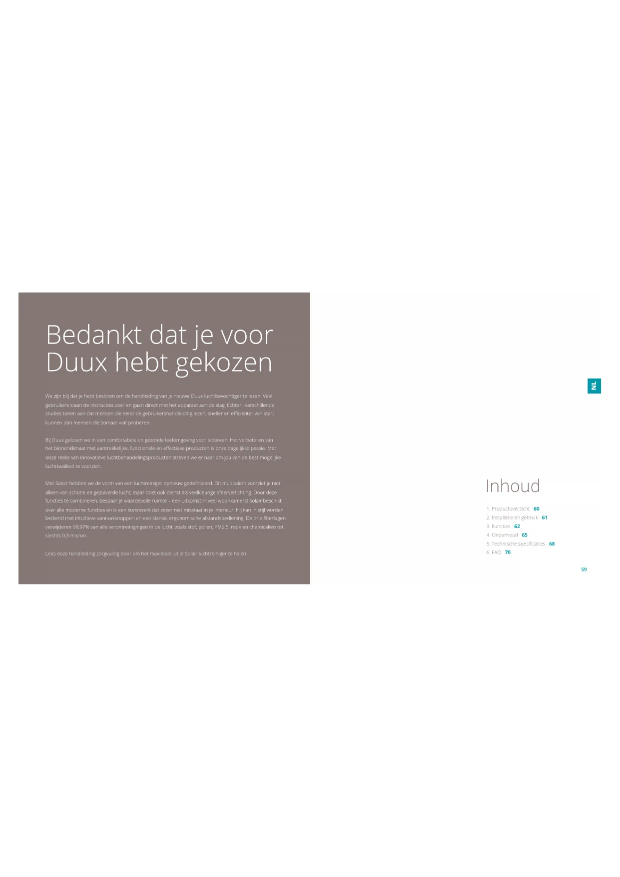 Bedankt dat je voor Duux hebt gekozen We zijn blij dat je hebt besloten om de handleiding van je nieuwe Duux luchtbevochtiger te lezen! Veel gebruikers slaan de instructies over en gaan direct met het apparaat aan de slag. Echter , verschillende studies tonen aan dat mensen die eerst de gebruikershandleiding lezen, sneller en eciënter van start kunnen dan mensen die zomaar wat proberen. Bij Duux geloven we in een comfortabele en gezonde leefomgeving voor iedereen. Het verbeteren van het binnenklimaat met aantrekkelijke, functionele en eectieve producten is onze dagelijkse passie. Met onze reeks van innovatieve luchtbehandelingsproducten streven we er naar om jou van de best mogelijke luchtkwaliteit te voorzien. Met Solair hebben we de vorm van een luchtreiniger opnieuw gedenieerd. Dit multitalent voorziet je niet alleen van schone en gezuiverde lucht, maar doet ook dienst als veelkleurige sfeerverlichting. Door deze functies te combineren, bespaar je waardevolle ruimte – een uitkomst in veel woonkamers! Solair beschikt over alle moderne functies en is een kunstwerk dat zeker niet misstaat in je interieur. Hij kan in stijl worden bediend met intuïtieve aanraakknoppen en een slanke, ergonomische afstandsbediening. De drie lterlagen verwijderen 99,97% van alle verontreinigingen in de lucht, zoals stof, pollen, PM2,5, rook en chemicaliën tot slechts 0,3 micron. Lees deze handleiding zorgvuldig door om het maximale uit je Solair luchtreiniger te halen.6160
