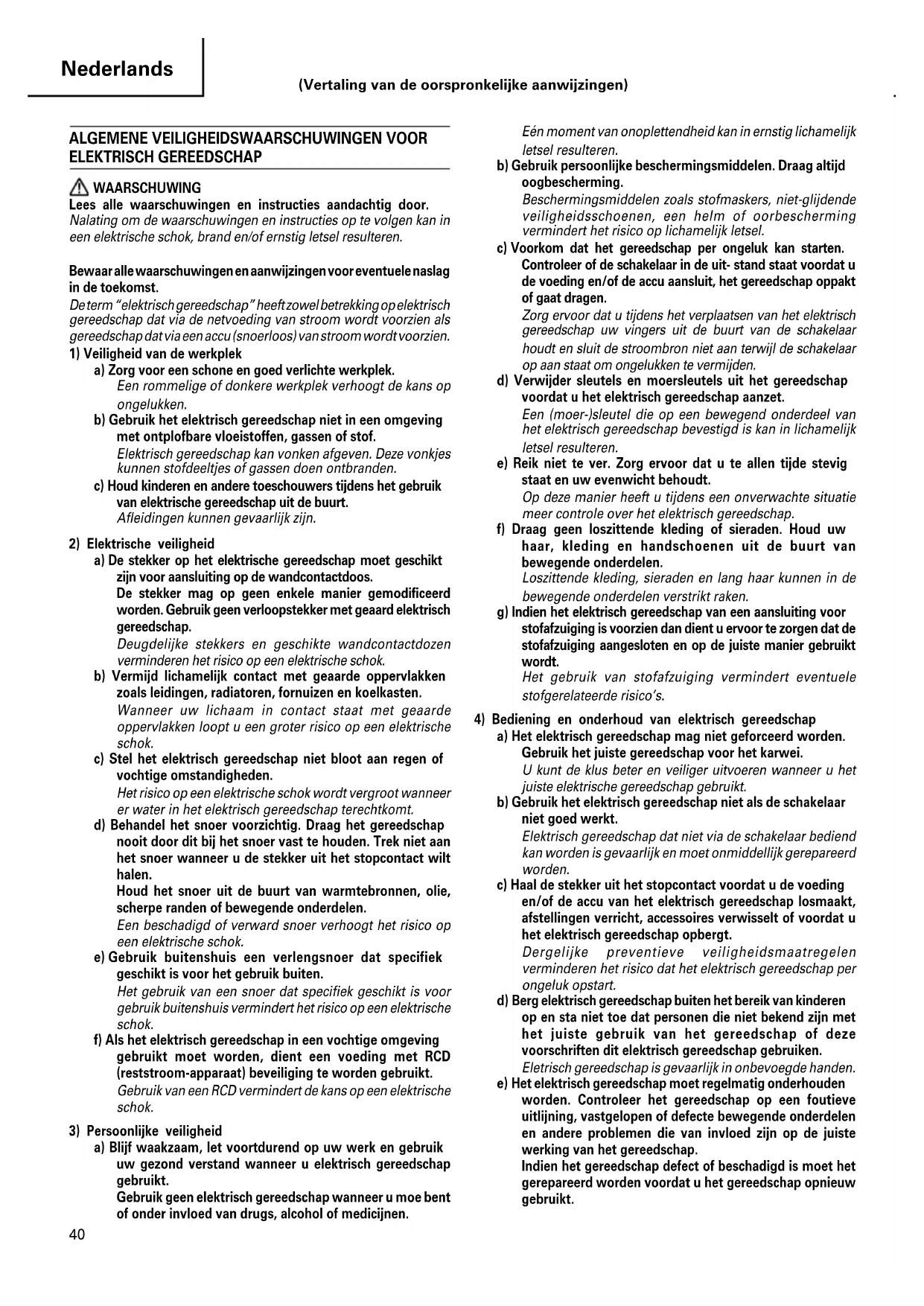 ELEKTRISCH GEREEDSCHAP WAARSCHUWING Lees alle waarschuwingen en instructies aandachtig door. Nalating om de waarschuwingen en instructies op te volgen kan in een elektrische schok, brand en/of ernstig letsel resulteren. Bewaar alle waarschuwingen en aanwijzingen voor eventuele naslag in de toekomst. De term “elektrisch gereedschap” heeft zowel betrekking op elektrisch gereedschap dat via de netvoeding van stroom wordt voorzien als gereedschap dat via een accu (snoerloos) van stroom wordt voorzien.