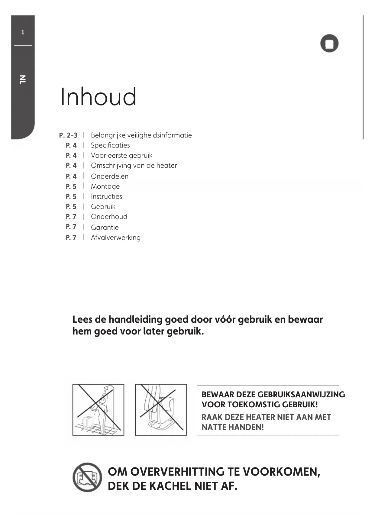 Voor eerste gebruikOmschrijving van de heaterOnderdelenMontageInstructiesGebruikOnderhoudGarantieAfvalverwerkingLEES DE HANDLEIDING AANDACHTIG DOOR.