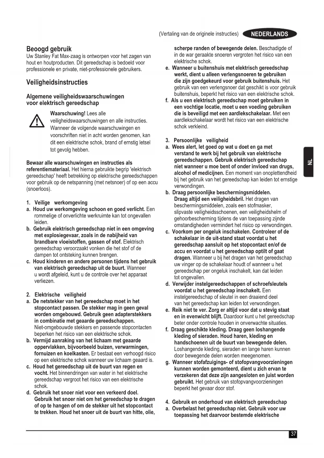 d. Bewaar nicht-gebruike elektrische gereedschappen buiten bereik van kinderen. Laat het gereedschap nicht gebruiken door personen die er net vertrouwd mee zijn en deze aanwijzingen Niet hebben gelezen. Elektrische gereedschappen zijn gevaarlijk wanner deze worden gebruikt door onervaren Personen.