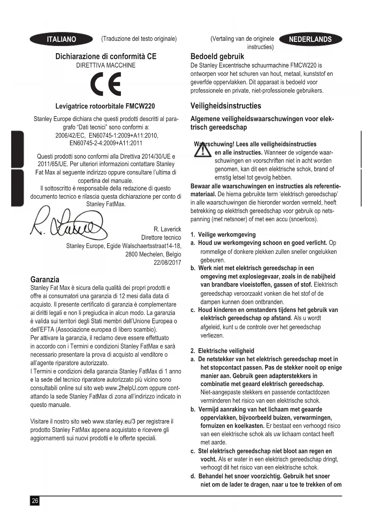 Deze producten voldoen tevens aan richtlijn 2014/30/EU en 2011/65/EU. Neem voor meer informatie contact op met Stanley Fat Max op het volgende adres of raadpleeg de achterzijde van de handleiding.