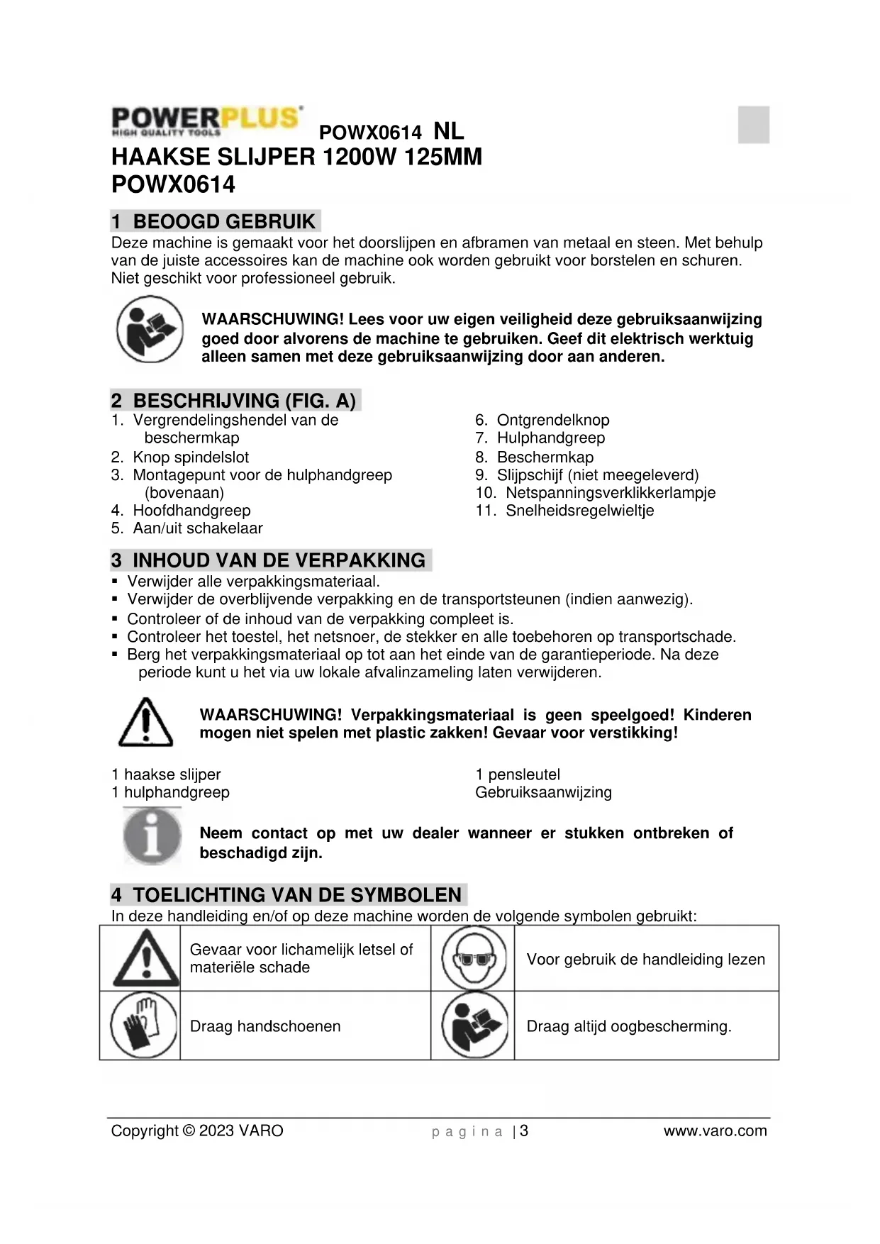 - Uw gereedschap moet als geheel naar uw dealer worden teruggebracht in een aanvaardbare staat van netheid, in zijn originele kunststof koffer (indien van toepassing op het product) en het moet vergezeld zijn van uw bewijs van aankoop. 16 MILIEU Indien u, na zekere tijd, beslist uw machine te vervangen, werp deze dan niet weg bij uw huishoudelijk afval maar doe dit op een milieuvriendelijke wijze. Het elektrische afval mag niet op dezelfde manier behandeld worden dan het gewone huishoudelijke afval. Breng het naar een recyclagecentrum op plaatsen waar zulke gepaste installaties bestaan. Raadpleeg de plaatselijke instanties of de verkoper voor adviezen over inzameling en verwerking.POWX0614 NL Copyright © 2023 VARO p a g i n a | 11 www.varo.com 17 CONFORMITEITSVERKLARING VARO N.V. - Vic. Van Rompuy N.V Joseph Van Instraat 9 - BE2500 Lier - BELGIUM, verklaart enkel dat, Product: Haakse slijper Handelsmerk: POWERplus Model: POWX0614 voldoet aan de essentiële eisen en aan de overige relevante bepalingen van de van toepassing zijnde Europese Richtlijnen/verordeningen, gebaseerd op de toepassing van Europese geharmoniseerde normen. Elke niet-toegelaten modificatie van het apparaat maakt deze verklaring nietig. Europese Richtlijnen/Verordeningen (inclusief, indien van toepassing, hun wijzigingen tot op de datum van ondertekening); 2011/65/EU 2006/42/EC 2014/30/EU Europese geharmoniseerde normen (inclusief, indien van toepassing, hun wijzigingen tot op de datum van ondertekening); EN60745-1 : 2009 EN60745-2-3 : 2011 EN55014-1 : 2017 EN55014-2 : 2015