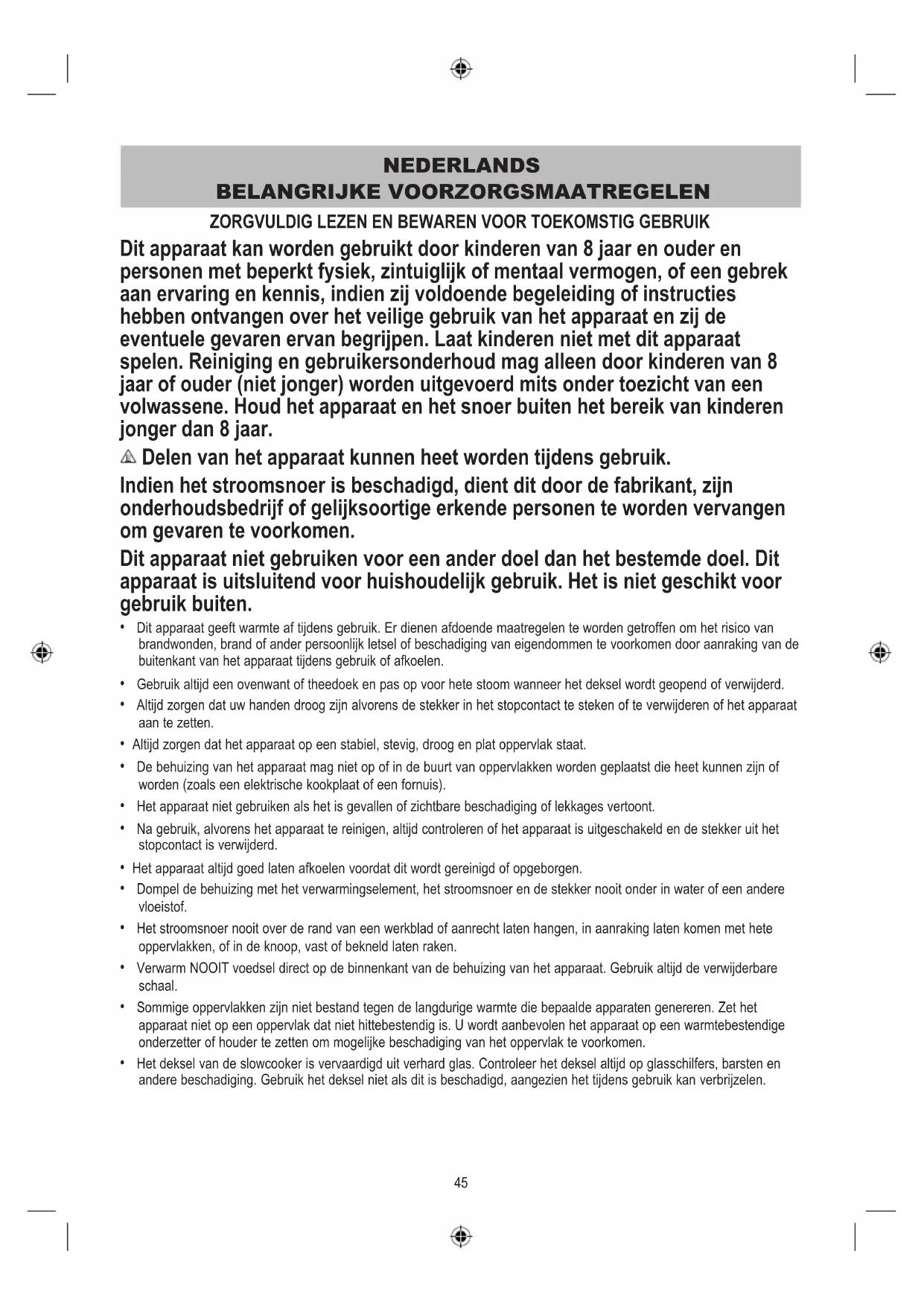 - l’apparecchiatura non sia stata modificata in alcun modo né soggetta a danni, uso improprio o abuso, a riparazione o alterazione per opera di un tecnico non autorizzato da JCS (Europe). I guasti intervenuti durante l’uso normale, per uso improprio, danno, abuso, tensione incorretta, cause naturali, eventi non determinati da JCS (Europe), riparazione o alterazione per opera di un tecnico non autorizzato da JCS (Europe) o la mancata ottemperanza alle istruzioni d’uso sono esclusi dalla presente garanzia. Inoltre, l’uso normale compreso, a titolo di esempio, una lieve alterazione del colore (sbiadimento) e i graffi, non sono coperti dalla presente garanzia. I diritti spettante all’utente ai sensi della presente garanzia si applicano unicamente all’acquirente originale e non si estendono all’uso commerciale o comunitario. Se l’apparecchiatura è fornita con un accordo specifico per il paese o una cartolina di garanzia, consultare le condizioni di tale accordo, che prevalgono su quelle esposte in questa sede oppure rivolgersi a un rivenditore autorizzato per ulteriori informazioni. Gli apparecchi elettrici non devono essere smaltiti insieme ai rifiuti domestici. Riciclare laddove esistano appositi impianti. Inviare una e-mail a enquiriesEurope@jardencs.com per ulteriori informazioni sul riciclo e sulla direttiva RAEE. Jarden Consumer Solutions (Europe) Limited 5400 Lakeside Cheadle Royal Business Park Cheadle SK8 3GQ United Kingdom45 NEDERLANDS BELANGRIJKE VOORZORGSMAATREGELEN ZORGVULDIG LEZEN EN BEWAREN VOOR TOEKOMSTIG GEBRUIK Dit apparaat kan worden gebruikt door kinderen van 8 jaar en ouder en personen met beperkt fysiek, zintuiglijk of mentaal vermogen, of een gebrek aan ervaring en kennis, indien zij voldoende begeleiding of instructies hebben ontvangen over het veilige gebruik van het apparaat en zij de eventuele gevaren ervan begrijpen. Laat kinderen niet met dit apparaat spelen. Reiniging en gebruikersonderhoud mag alleen door kinderen van 8 jaar of ouder (niet jonger) worden uitgevoerd mits onder toezicht van een volwassene. Houd het apparaat en het snoer buiten het bereik van kinderen jonger dan 8 jaar. Delen van het apparaat kunnen heet worden tijdens gebruik. Indien het stroomsnoer is beschadigd, dient dit door de fabrikant, zijn onderhoudsbedrijf of gelijksoortige erkende personen te worden vervangen om gevaren te voorkomen. Dit apparaat niet gebruiken voor een ander doel dan het bestemde doel. Dit apparaat is uitsluitend voor huishoudelijk gebruik. Het is niet geschikt voor gebruik buiten.