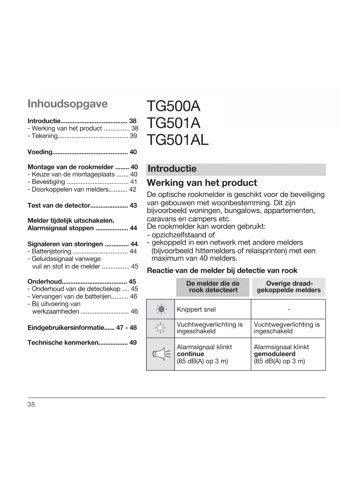 - Vuchtwegverlichting is ingeschakeld Alarmsignaal klinkt gemoduleerd (85 dB(A) op 3 m) Knippert snel De melder die de rook detecteert Vuchtwegverlichting is ingeschakeld Overige draad- gekoppelde melders Alarmsignaal klinkt continue (85 dB(A) op 3 m) TG500A TG501A TG501AL Werking van het product De optische rookmelder is geschikt voor de beveiliging van gebouwen met woonbestemming. Dit zijn bijvoorbeeld woningen, bungalows, appartementen, caravans en campers etc. De rookmelder kan worden gebruikt: - opzichzelfstaand of - gekoppeld in een netwerk met andere melders (bijvoorbeeld hittemelders of relaisprinten) met een maximum van 40 melders. Reactie van de melder bij detectie van rook Introductie Introductie p. 38
