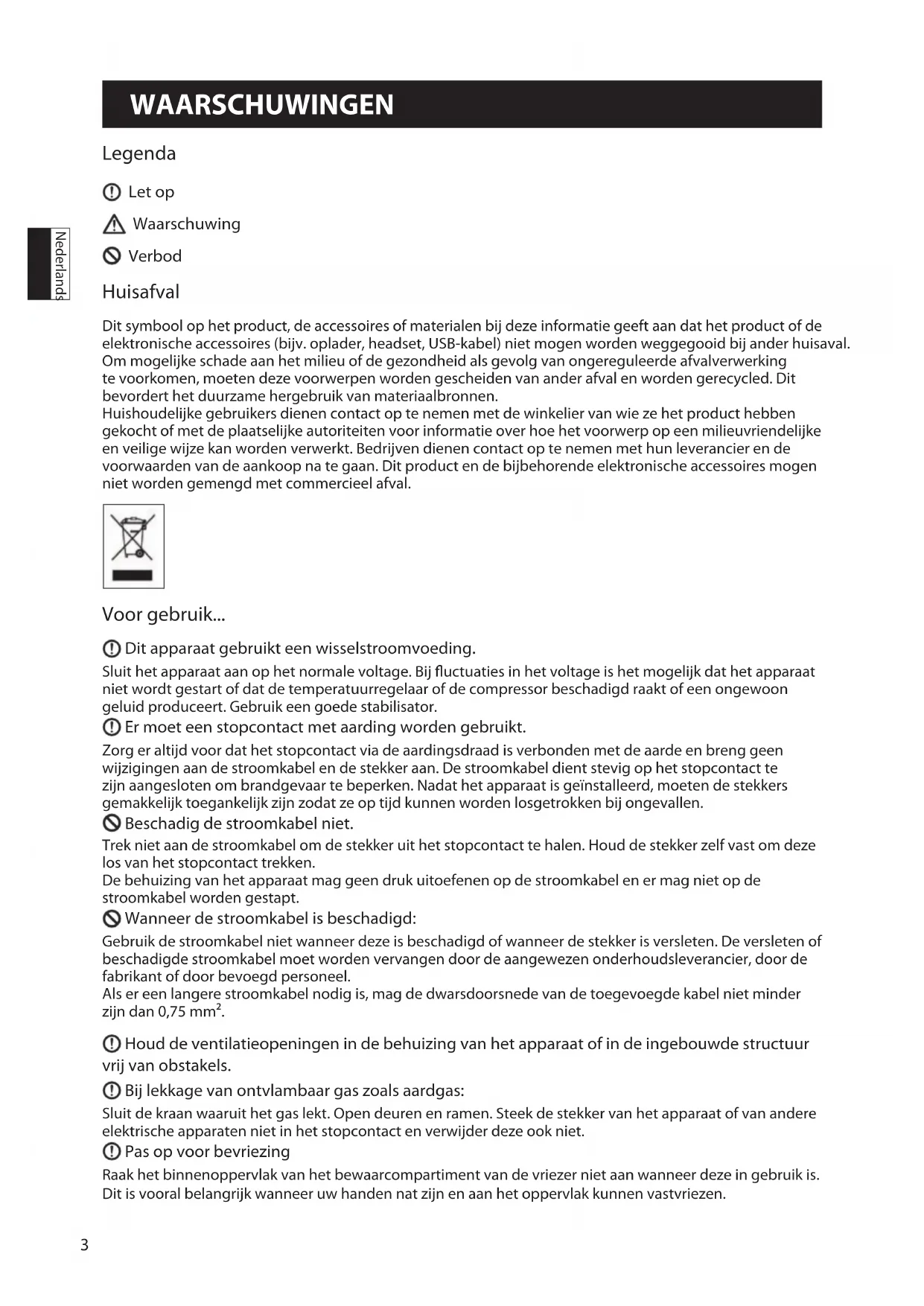 Legenda Let op Waarschuwing Verbod Huisafval Dit symbool op het product, de accessoires of materialen bij deze informatie geeft aan dat het product of de elektronische accessoires (bijv. oplader, headset, USB-kabel) niet mogen worden weggegooid bij ander huisaval. Om mogelijke schade aan het milieu of de gezondheid als gevolg van ongereguleerde afvalverwerking te voorkomen, moeten deze voorwerpen worden gescheiden van ander afval en worden gerecycled. Dit bevordert het duurzame hergebruik van materiaalbronnen. Huishoudelijke gebruikers dienen contact op te nemen met de winkelier van wie ze het product hebben gekocht of met de plaatselijke autoriteiten voor informatie over hoe het voorwerp op een milieuvriendelijke en veilige wijze kan worden verwerkt. Bedrijven dienen contact op te nemen met hun leverancier en de voorwaarden van de aankoop na te gaan. Dit product en de bijbehorende elektronische accessoires mogen niet worden gemengd met commercieel afval. Voor gebruik... Dit apparaat gebruikt een wisselstroomvoeding. Sluit het apparaat aan op het normale voltage. Bij uctuaties in het voltage is het mogelijk dat het apparaat niet wordt gestart of dat de temperatuurregelaar of de compressor beschadigd raakt of een ongewoon geluid produceert. Gebruik een goede stabilisator. Er moet een stopcontact met aarding worden gebruikt. Zorg er altijd voor dat het stopcontact via de aardingsdraad is verbonden met de aarde en breng geen wijzigingen aan de stroomkabel en de stekker aan. De stroomkabel dient stevig op het stopcontact te zijn aangesloten om brandgevaar te beperken. Nadat het apparaat is geïnstalleerd, moeten de stekkers gemakkelijk toegankelijk zijn zodat ze op tijd kunnen worden losgetrokken bij ongevallen. Beschadig de stroomkabel niet. Trek niet aan de stroomkabel om de stekker uit het stopcontact te halen. Houd de stekker zelf vast om deze los van het stopcontact trekken. De behuizing van het apparaat mag geen druk uitoefenen op de stroomkabel en er mag niet op de stroomkabel worden gestapt. Wanneer de stroomkabel is beschadigd: Gebruik de stroomkabel niet wanneer deze is beschadigd of wanneer de stekker is versleten. De versleten of beschadigde stroomkabel moet worden vervangen door de aangewezen onderhoudsleverancier, door de fabrikant of door bevoegd personeel. Als er een langere stroomkabel nodig is, mag de dwarsdoorsnede van de toegevoegde kabel niet minder zijn dan 0,75 mm². Houd de ventilatieopeningen in de behuizing van het apparaat of in de ingebouwde structuur vrij van obstakels. Bij lekkage van ontvlambaar gas zoals aardgas: Sluit de kraan waaruit het gas lekt. Open deuren en ramen. Steek de stekker van het apparaat of van andere elektrische apparaten niet in het stopcontact en verwijder deze ook niet. Pas op voor bevriezing Raak het binnenoppervlak van het bewaarcompartiment van de vriezer niet aan wanneer deze in gebruik is. Dit is vooral belangrijk wanneer uw handen nat zijn en aan het oppervlak kunnen vastvriezen. WAARSCHUWINGEN4 WAARSCHUWINGEN Nederlands Wanneer het apparaat niet meer wordt gebruikt: Houd het apparaat uit de buurt van vuur om ongevallen te voorkomen. Verwijder de deur van het apparaat (open de deur, houd deze vast en verwijder de schroeven), om ongevallen met kinderen die in het apparaat kruipen te voorkomen. Stuur het apparaat naar de aanwezen plek voor afvalverwerking. Open de deur met de hendel. Bewaar en gebruik geen benzine of andere ontvlambare stoen in de buurt van de vriezer om brand te voorkomen. Bewaar nooit ontvlambare stoen, explosieven of sterk corrosieve zuren/basen en andere chemische stoen in de vriezer. Bewaar geen essen bier of andere dranken in de vriezer aangezien deze kunnen barsten tijdens het bevriezen. Gebruik geen elektrische apparaten binnen de opslagcompartimenten in het apparaat, tenzij ze van een door de fabrikant aanbevolen type zijn. Let op uw kinderen Kinderen mogen nooit spelen met het apparaat. Hang niet aan de deur om persoonlijk letsel te voorkomen. De deur van het apparaat kan afbreken. Zorg ervoor dat handen en voeten van kinderen niet in gaten en naden tussen metalen onderdelen komen, zoals in het compartiment aan de achterzijde van het apparaat, om persoonlijk letsel te voorkomen. Plaats geen instabiele voorwerpen (zware voorwerpen, bakken met water) boven op het apparaat, om persoonlijk letsel door vallen of elektrische schokken als gevolg van contact met water te voorkomen. Blijf uit de buurt van water Spuit geen water op de vriezer en spoel deze niet door met water. Zet de vriezer niet op een natte locatie of waar deze kan worden bespat met water, om te voorkomen dat de elektrische isolatie beschadigd raakt of tot schokken of brand leidt. Beschadig het koelmiddelcircuit niet Demontage en aanpassing van de vriezer moet eerst worden geautoriseerd. Bij schuddende bewegingen van de vriezer kunnen de koelleidingen beschadigd raken. Reparatie van het apparaat moet worden uitgevoerd door professioneel personeel. Haal de stekker in dit geval uit het stopcontact: Voordat reinigings- of onderhoudswerkzaamheden worden uitgevoerd of bij storingen of uitschakeling, dient u de stekker van de vriezer uit het stopcontact te halen. Wacht minstens 5 minuten nadat u de stekker van het apparaat hebt verwijderd omdat bij vaak herhaaldelijk starten de compressor beschadigd kan raken. Deze vriezer is een huishoudelijk apparaat dat alleen is bedoeld voor het bewaren van voedsel. Bewaar geen bloed, medicijnen, biologische producten en andere producten in het apparaat. Houd de ventilatieopeningen in de behuizing van het apparaat of in de ingebouwde structuur vrij van obstakels. Dit apparaat is niet bedoeld voor gebruik door personen (waaronder kinderen) met lichamelijke, zintuiglijke of geestelijke beperkingen, of voor personen die niet beschikken over kennis of ervaring, tenzij zij onder supervisie staan van een persoon die voor hun veiligheid verantwoordelijk is of van een dergelijk persoon instructies hebben gekregen over het gebr