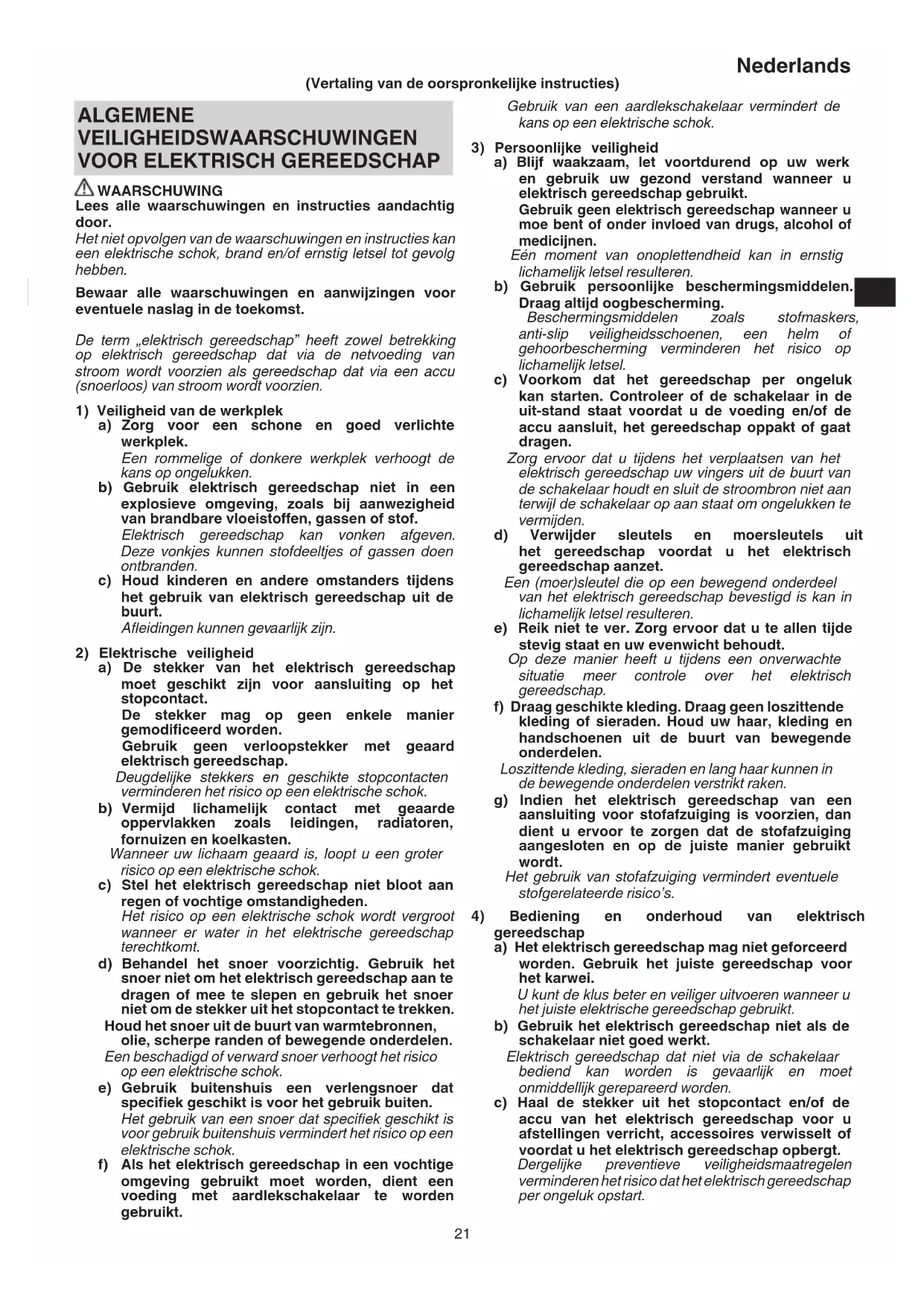 WAARSCHUWING Lees alle waarschuwingen en instructies aandachtig door. Het niet opvolgen van de waarschuwingen en instructies kan een elektrische schok, brand en/of ernstig letsel tot gevolg hebben. Bewaar alle waarschuwingen en aanwijzingen voor eventuele naslag in de toekomst. De term „elektrisch gereedschap” heeft zowel betrekking op elektrisch gereedschap dat via de netvoeding van stroom wordt voorzien als gereedschap dat via een accu (snoerloos) van stroom wordt voorzien.