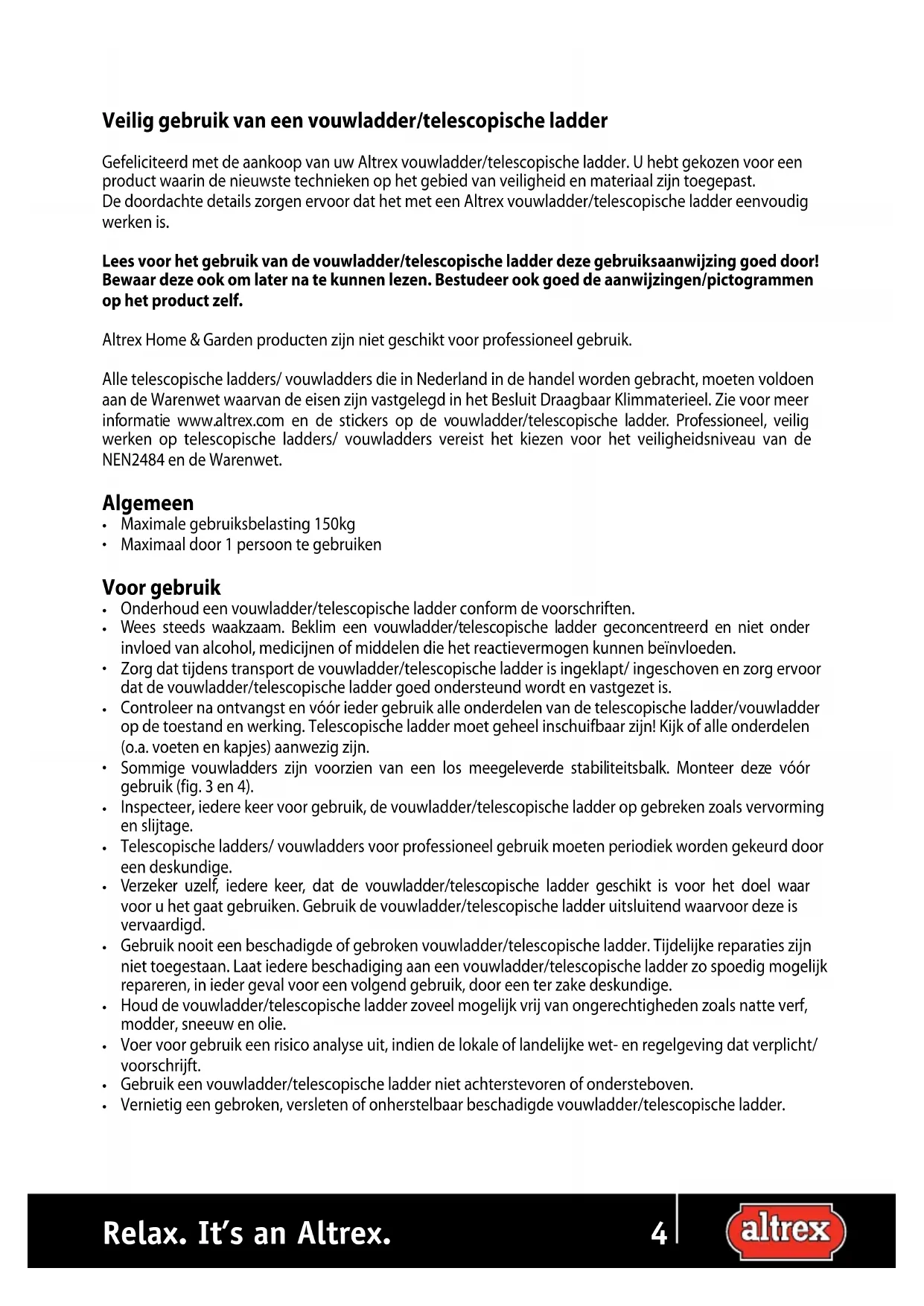 13Veilig gebruik van een vouwladder/telescopische ladder Gefeliciteerd met de aankoop van uw Altrex vouwladder/telescopische ladder. U hebt gekozen voor een product waarin de nieuwste technieken op het gebied van veiligheid en materiaal zijn toegepast. De doordachte details zorgen ervoor dat het met een Altrex vouwladder/telescopische ladder eenvoudig werken is. Lees voor het gebruik van de vouwladder/telescopische ladder deze gebruiksaanwijzing goed door! Bewaar deze ook om later na te kunnen lezen. Bestudeer ook goed de aanwijzingen/pictogrammen op het product zelf. Altrex Home & Garden producten zijn niet geschikt voor professioneel gebruik. Alle telescopische ladders/ vouwladders die in Nederland in de handel worden gebracht, moeten voldoen aan de Warenwet waarvan de eisen zijn vastgelegd in het Besluit Draagbaar Klimmaterieel. Zie voor meer informatie www.altrex.com en de stickers op de vouwladder/telescopische ladder. Professioneel, veilig werken op telescopische ladders/ vouwladders vereist het kiezen voor het veiligheidsniveau van de NEN2484 en de Warenwet. Algemeen Maximale gebruiksbelasting 150kg Maximaal door 1 persoon te gebruiken Voor gebruik Onderhoud een vouwladder/telescopische ladder conform de voorschriften. Wees steeds waakzaam. Beklim een vouwladder/telescopische ladder geconcentreerd en niet onder invloed van alcohol, medicijnen of middelen die het reactievermogen kunnen beïnvloeden. Zorg dat tijdens transport de vouwladder/telescopische ladder is ingeklapt/ ingeschoven en zorg ervoor dat de vouwladder/telescopische ladder goed ondersteund wordt en vastgezet is. Controleer na ontvangst en vóór ieder gebruik alle onderdelen van de telescopische ladder/vouwladder op de toestand en werking. Telescopische ladder moet geheel inschuifbaar zijn! Kijk of alle onderdelen (o.a. voeten en kapjes) aanwezig zijn. Sommige vouwladders zijn voorzien van een los meegeleverde stabiliteitsbalk. Monteer deze vóór gebruik (fig. 3 en 4). Inspecteer, iedere keer voor gebruik, de vouwladder/telescopische ladder op gebreken zoals vervorming en slijtage. Telescopische ladders/ vouwladders voor professioneel gebruik moeten periodiek worden gekeurd door een deskundige. Verzeker uzelf, iedere keer, dat de vouwladder/telescopische ladder geschikt is voor het doel waar voor u het gaat gebruiken. Gebruik de vouwladder/telescopische ladder uitsluitend waarvoor deze is vervaardigd. Gebruik nooit een beschadigde of gebroken vouwladder/telescopische ladder. Tijdelijke reparaties zijn niet toegestaan. Laat iedere beschadiging aan een vouwladder/telescopische ladder zo spoedig mogelijk repareren, in ieder geval voor een volgend gebruik, door een ter zake deskundige. Houd de vouwladder/telescopische ladder zoveel mogelijk vrij van ongerechtigheden zoals natte verf, modder, sneeuw en olie. Voer voor gebruik een risico analyse uit, indien de lokale of landelijke wet- en regelgeving dat verplicht/ voorschrijft. Gebruik een vouwladder/telescopische ladder niet achterstevoren of ondersteboven. Vernietig een gebroken, versleten of onherstelbaar beschadigde vouwladder/telescopische ladder.