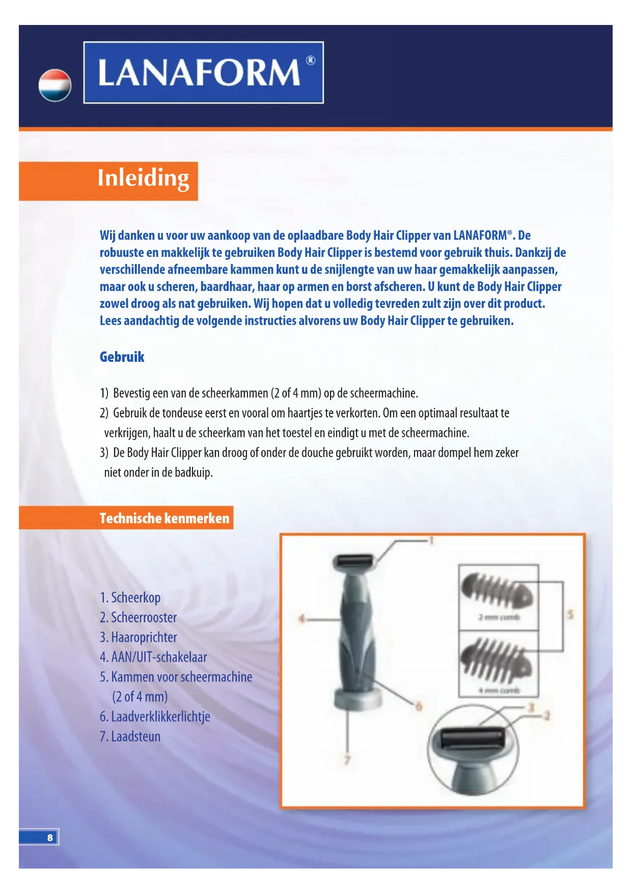 9. Dit toestel is niet voorzien voor gebruik door personen (onder wie kinderen) met beperkte fysieke, zintuiglijke of mentale capaciteiten, of personen zonder enige ervaring of kennis, behalve indien ze via een persoon die instaat voor hun veiligheid, bewaking gekregen hebben of instructies vooraf over het gebruik van het toestel. Het is aan te bevelen kinderen in de gaten te houden om er zeker van te zijn dat ze niet met het toestel spelen.11 Body Hair Clipper Milieubescherming De Body Hair Clipper bevat herlaadbare Ni-Cd-batterijen. Wanneer deze aan het einde van hun leven zijn, neemt u de scheerkop af door aan de voorkant te trekken en tegelijk uw vingers te beschermen met een vod. Schroef de schroeven van de kop los. Haal eerst de kop af. Klop met het toestel op een tafel beschermd met een dikke vod om het huis te openen. Snijd de solderingen door en neem de batterij uit het toestel en om hem op de correcte wijze te laten verwerken. Breng de batterij binnen bij de verkoper of geef hem af op de daartoe voorziene plaats, conform de wettelijke bepalingen die gelden in uw streek. BEPERKTE GARANTIE LANAFORM® garandeert dit product tegen gebrekkige onderdelen en fabricagefouten. Het toestel geniet een garantie van twee jaar vanaf de aankoopdatum, met uitzondering van de onderstaande voorwaarden. De garantie op dit LANAFORM®-product dekt geen schade veroorzaakt door een slecht of verkeerd gebruik van het toestel, een ongeluk, het toevoegen van niet-toegestane accessoires, het aanpassen van het product of om het even welke andere omstandigheid waarvoor LANAFORM® niet aansprakelijk kan worden gesteld. LANAFORM® kan niet aansprakelijk worden gesteld voor het vergoeden van gevolgschade, onrechtstreekse schade of speci eke schade. Alle impliciete geschiktheidsgaranties zijn beperkt tot een periode van twee jaar, te rekenen vanaf de oorspronkelijke aankoopdatum. Na ontvangst zal LANAFORM® uw scheermachine met tondeuse herstellen of desgevallend vervangen en haar u gratis terugsturen. De garantie wordt slechts uitgevoerd via het Servicecentrum van LANAFORM®. Elke onderhoudsactiviteit op dit product die wordt toevertrouwd aan een andere persoon dan iemand van het Servicecentrum van LANAFORM® doet deze garantie vervallen.12 Einleitung Wir danken Ihnen für Ihren Kauf des wiederau adbaren Körperhaarrasierers von Lanaform. Der robuste und benutzerfreundliche Rasierer ist für den Hausgebrauch bestimmt. Dank der abne- hmbaren unterschiedlichen Kämme können Sie leicht die gewünschte Schnittlänge Ihres Haares einstellen, sich aber auch rasieren bzw. die Barthaare, die Achselhöhle oder Brust rasieren. Sie können den Körperhaarrasierer sowohl trocken als auch nass benutzen. Wir ho en, dass dieses Gerät Sie voll und ganz zufrieden stellen wird. Lesen Sie bitte aufmerksam die nachstehenden Anweisungen, bevor Sie den Rasierer benutzen. Anwendung