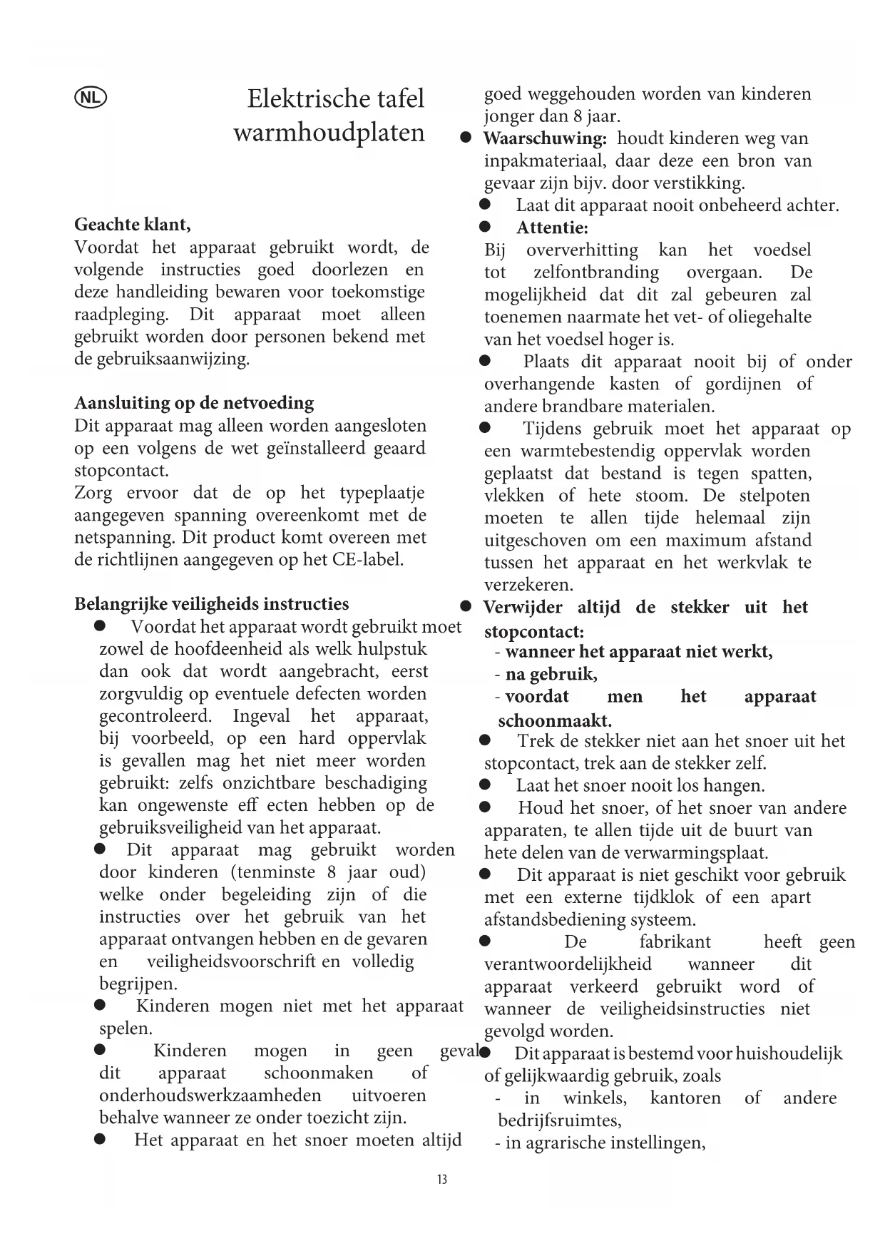 - door klanten in hotels, motels enz. en gelijkwaardige etablissementen, - in bed bed-and breakfast gasthuizen. Gebruik alleen originele bijbehorende onderdelen; gebruik van hulpstukken anders dan deze bijgeleverd door de fabrikant kunnen zeer gevaarlijk zijn voor de gebruiker. Bij de reparatie van elektrische apparaten moeten veiligheidsaspecten in acht genomen worden. Reparaties mogen daarom slechts door erkende vakmensen uitgevoerd worden, zelfs de vervanging van het snoer. Indien dit apparaat kapot is, stuur het dan aan de klantenservice van de fabrikant. Het adres vindt u achterin deze gebruiksaanwijzing. Opstarten Voordat het apparaat voor de eerste keer wordt gebruikt laat het gedurende 3 minuten op vol vermogen heet worden (zonder dat men een pot of steelpan gebruikt), zorg hierbij voor voldoende ventilatie. Dit zal helpen de beschermende coating ‘in te branden’, die de warmhoudplaat tegen corrosie beschermt. Tijdens dit proces zal een lichte geur en een beetje rook afgescheiden worden. Dit is normaal en zal maar even duren. Zorg voor voldoende ventilatie. Maak het apparaat daarna schoon zoals hierna is beschreven in de sectie Algemeen onderhoud en reiniging. Gebruik – Altijd eerst een pot / pan op de warmhoudplaat zetten voordat het apparaat wordt aangeschakeld. – Zorg ervoor dat de pot / pan schoon is en droog aan de buitenkant. Geen met roet of vuil bedekte potten / pannen gebruiken. – Om beschadiging van de verwarmingsplaat te voorkomen wordt geadviseerd uitsluitend potten / pannen met een vlakke bodem te gebruiken. Het meest geschikt zijn potten die speciaal voor gebruik op elektrische platen zijn ontworpen.(zie a eelding I). – Men moet er te allen tijde voor zorgen dat de pot / pan die gebruikt wordt dezelfde diameter hee als de warmhoudplaat: dit verminderd het verlies aan warmte en voorkomt dat de plaat wordt beschadigd door een ongelijke warmteverdeling. Instelling van de thermostaat 6 : Voorkoken en snel-braden 4-5 : Normaal koken, braden 2-4 : Sudderen Zet na gebruik de thermostaatknop in de ‘’ stand. Verwijder hierna de stekker uit het stopcontact om te verzekeren dat het ap-paraat geheel van het stroomnet is verwijderd. Indicatielampje Het indicatielampje blij aan terwijl de warmhoudplaat aan het opwarmen is. Het zal uitgaan wanneer de voorgeprogrammeerde temperatuur bereikt is. Algemeen onderhoud en reiniging Haal altijd de stekker uit het stopcontact en laat het apparaat geheel a oelen voordat men het schoonmaakt Om een elektrische schok te voorkomen dit apparaat nooit schoonmaken met water en dompel het nooit onder. Gebruik geen schuurmiddelen of bijtende schoonmaakproducten. Na gebruik kan met een natte doek eventuele morserijen van de platen worden verwijderd. Een speciaal schoonmaakmiddel moet gebruikt worden om de plaat van tijd tot tijd te behandelen. Verwijdering Gooi nooit oude of defecte apparaten weg in het normale huisvuil, maar alleen in de daarvoor beschikbare publieke collectiepunten. 14Garantieverklaring Voor dit apparaat geldt een garantie van twee jaar na de aankoopdatum voor materiaal- en fabrieksfouten. Uitgesloten van garantie is schade die ontstaan is door het niet in acht nemen van de gebruiksaanwijzing, normale slijtage en zeer breekbare onderdelen als glaskannen etc. Deze garantieverklaring hee geen invloed op uw wettelijke rechten, en ook niet op uw legale rechten welke men hee als een consument onder de toepasselijke nationale wetgeving welke de aankoop van goederen beheerst. De garantie vervalt bij reparatie door niet door ons bevoegde instellingen. 15Placas eléctricas de mesa Estimado Cliente, Antes de utilizar el aparato, lea atentamente estas instrucciones y conserve este manual para cualquier consulta posterior. El aparato sólo debe ser usado por personas que se han familiarizado con estas instrucciones. Conexión a la red eléctrica Este aparato solo se debe conectar a una toma de tierra instalada según las normas en vigor. Asegúrese de que la tensión de la red coincide con la tensión indicada en la placa de características. Este producto cumple con las directivas obligatorias que acompañan el etiquetado de la CEE. Importantes instrucciones sobre seguridad Antes de utilizar el aparato, se debe comprobar que tanto la unidad principal como cualquier accesorio no están defectuosos. En caso de que el aparato caiga sobre una super cie dura, por ejemplo, no se debe utilizar de nuevo: incluso los desperfectos no visibles pueden tener efectos adversos sobre la seguridad en el uso del aparato. Este aparato podrá ser utilizado por niños (mayores de 8 años) y personas con reducidas facultades físicas, sensoriales o mentales, o sin experiencia ni conocimiento del producto, siempre que hayan recibido la supervisión o instrucciones referentes al uso del aparato y entiendan por completo el peligro y las precauciones de seguridad. Los niños no deben jugar con el aparato. No se debe permitir que los niños realicen ningún trabajo de limpieza o mantenimiento del aparato a menos que estén bajo vigilancia. El aparato y su cable eléctrico siempre se deben mantener fuera del alcance de niños menores de 8 años. Precaución: mantenga a los niños alejados del material de embalaje, porque podría ser peligroso, existe el peligro de as xia. No deje el aparato sin vigilar durante su funcionamiento. Cuidado: Cuando se caliente en exceso, el alimento se podría prender fuego. Sin embargo, la probabilidad de que esto suceda incrementa con los alimentos de alto contenido en grasa o aceite. No utilice ni coloque este aparato cerca de objetos tales como cortinas o materiales in amables. Durante su funcionamiento, se deberá colocar el aparato sobre una super cie resistente al calor, a las salpicaduras, manchas o al vapor caliente. Los pies deberán estar siempre totalmente extendidos para mantener la distancia máxima entre el aparato y la super cie de trabajo. Desenchufe siempre el aparato - si hay una avería, - después del uso