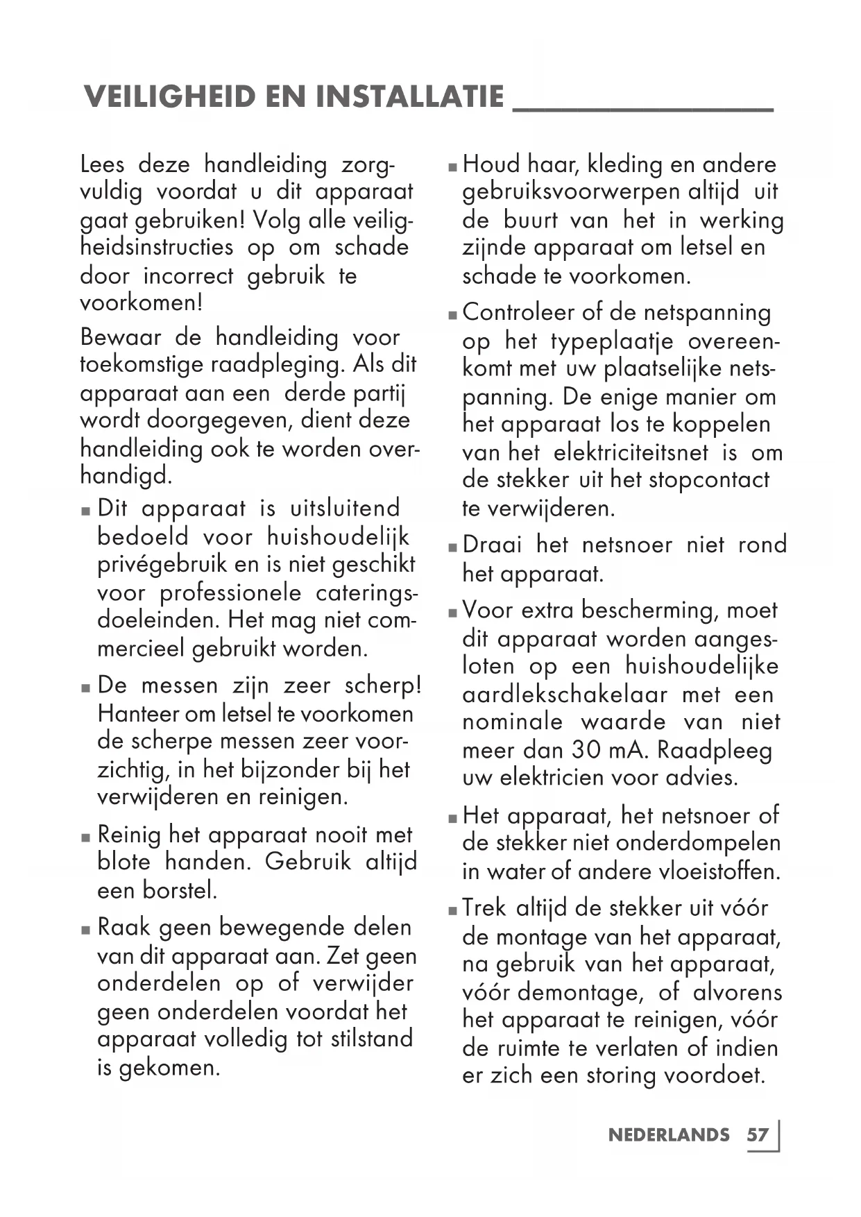 Trek altijd de stekker uit vóór de montage van het apparaat, na gebruik van het apparaat, vóór demontage, of alvorens het apparaat te reinigen, vóór de ruimte te verlaten of indien er zich een storing voordoet.58 NEDERL ANDS Verwijder de stekker niet door aan het snoer te trekken.