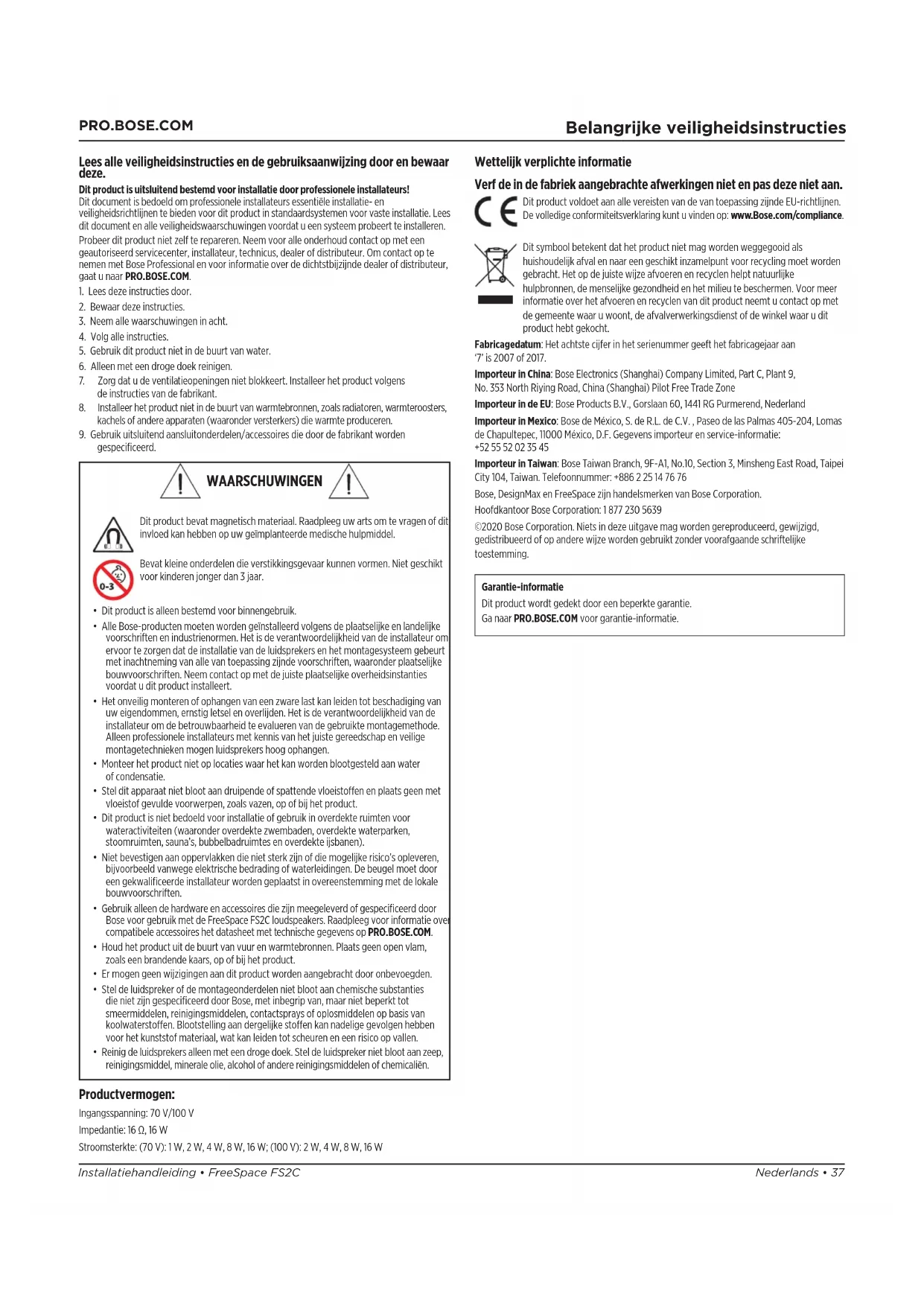 gespecificeerd. Wettelijk verplichte informatie Verf de in de fabriek aangebrachte afwerkingen niet en pas deze niet aan. Dit product voldoet aan alle vereisten van de van toepassing zijnde EU-richtlijnen. De volledige conformiteitsverklaring kunt u vinden op: www.Bose.com/compliance. Dit symbool betekent dat het product niet mag worden weggegooid als huishoudelijk afval en naar een geschikt inzamelpunt voor recycling moet worden gebracht. Het op de juiste wijze afvoeren en recyclen helpt natuurlijke hulpbronnen, de menselijke gezondheid en het milieu te beschermen. Voor meer informatie over het afvoeren en recyclen van dit product neemt u contact op met de gemeente waar u woont, de afvalverwerkingsdienst of de winkel waar u dit product hebt gekocht. Fabricagedatum: Het achtste cijfer in het serienummer geeft het fabricagejaar aan ‘7’ is 2007 of 2017. Importeur in China: Bose Electronics (Shanghai) Company Limited, Part C, Plant 9, No. 353 North Riying Road, China (Shanghai) Pilot Free Trade Zone Importeur in de EU: Bose Products B.V., Gorslaan 60, 1441 RG Purmerend, Nederland Importeur in Mexico: Bose de México, S. de R.L. de C.V. , Paseo de las Palmas 405-204, Lomas de Chapultepec, 11000 México, D.F. Gegevens importeur en service-informatie: +52 55 52 02 35 45 Importeur in Taiwan: Bose Taiwan Branch, 9F-A1, No.10, Section 3, Minsheng East Road, Taipei City 104, Taiwan. Telefoonnummer: +886 2 25 14 76 76 Bose, DesignMax en FreeSpace zijn handelsmerken van Bose Corporation. Hoofdkantoor Bose Corporation: 1 877 230 5639 ©2020 Bose Corporation. Niets in deze uitgave mag worden gereproduceerd, gewijzigd, gedistribueerd of op andere wijze worden gebruikt zonder voorafgaande schriftelijke toestemming. Garantie-informatie Dit product wordt gedekt door een beperkte garantie. Ga naar PRO.BOSE.COM voor garantie-informatie. Productvermogen: Ingangsspanning: 70 V/100 V Impedantie: 16 Ω, 16 W Stroomsterkte: (70 V): 1 W, 2 W, 4 W, 8 W, 16 W; (100 V): 2 W, 4 W, 8 W, 16 W WAARSCHUWINGEN Dit product bevat magnetisch materiaal. Raadpleeg uw arts om te vragen ofdit invloed kan hebben op uw geïmplanteerde medische hulpmiddel. Bevat kleine onderdelen die verstikkingsgevaar kunnen vormen. Niet geschikt voor kinderen jonger dan 3 jaar.