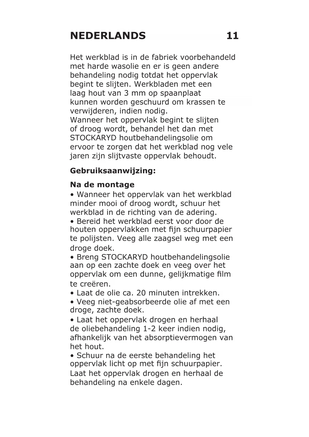 Trempez tout chiffon imprégné du produit dans de l'eau immédiatement après utilisation ou conserver dans un récipient hermétique en verre ou en métal an d'éviter tout risque d'auto-inammation. Entretien11 Het werkblad is in de fabriek voorbehandeld met harde wasolie en er is geen andere behandeling nodig totdat het oppervlak begint te slijten. Werkbladen met een laag hout van 3 mm op spaanplaat kunnen worden geschuurd om krassen te verwijderen, indien nodig. Wanneer het oppervlak begint te slijten of droog wordt, behandel het dan met STOCKARYD houtbehandelingsolie om ervoor te zorgen dat het werkblad nog vele jaren zijn slijtvaste oppervlak behoudt. Gebruiksaanwijzing: Na de montage