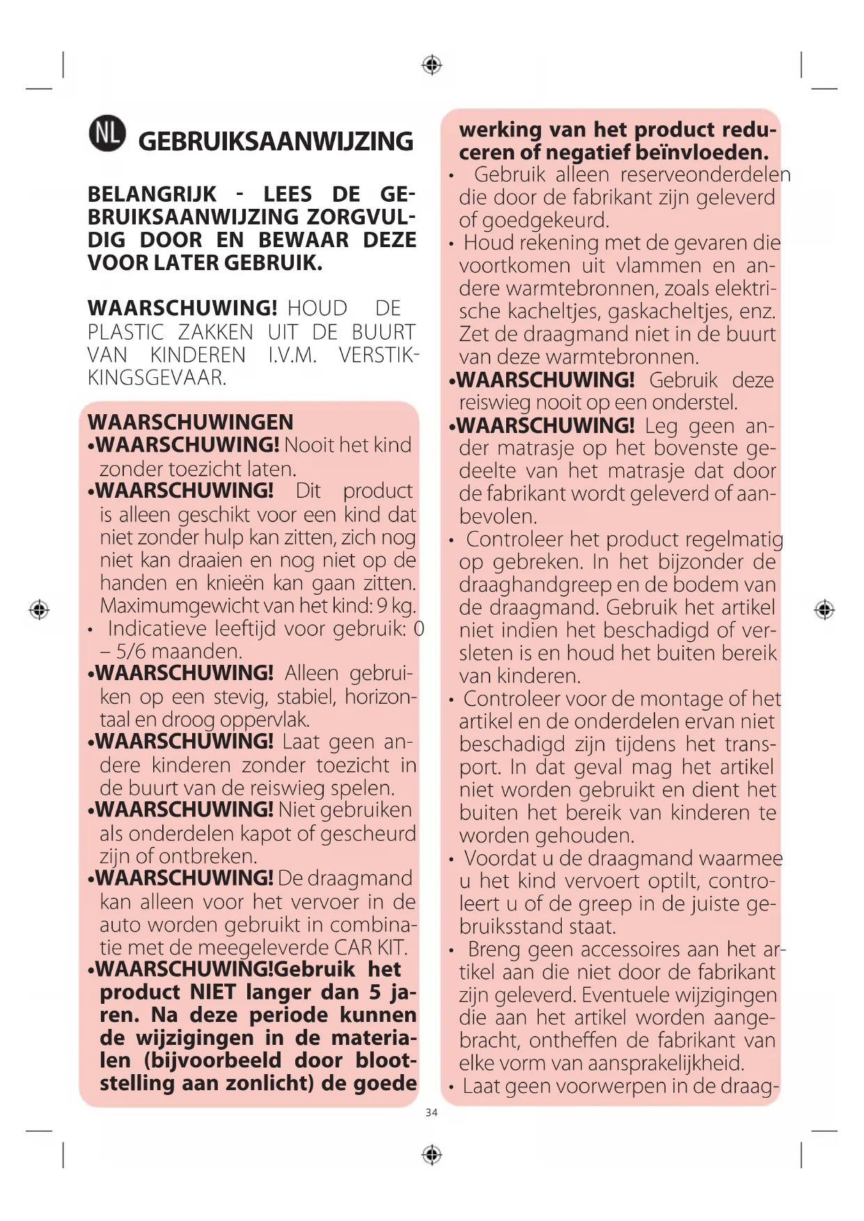 - WAARSCHUWING! Dit product is alleen geschikt voor een kind dat niet zonder hulp kan zitten, zich nog niet kan draaien en nog niet op de handen en knieën kan gaan zitten. Maximumgewicht van het kind: 9 kg.