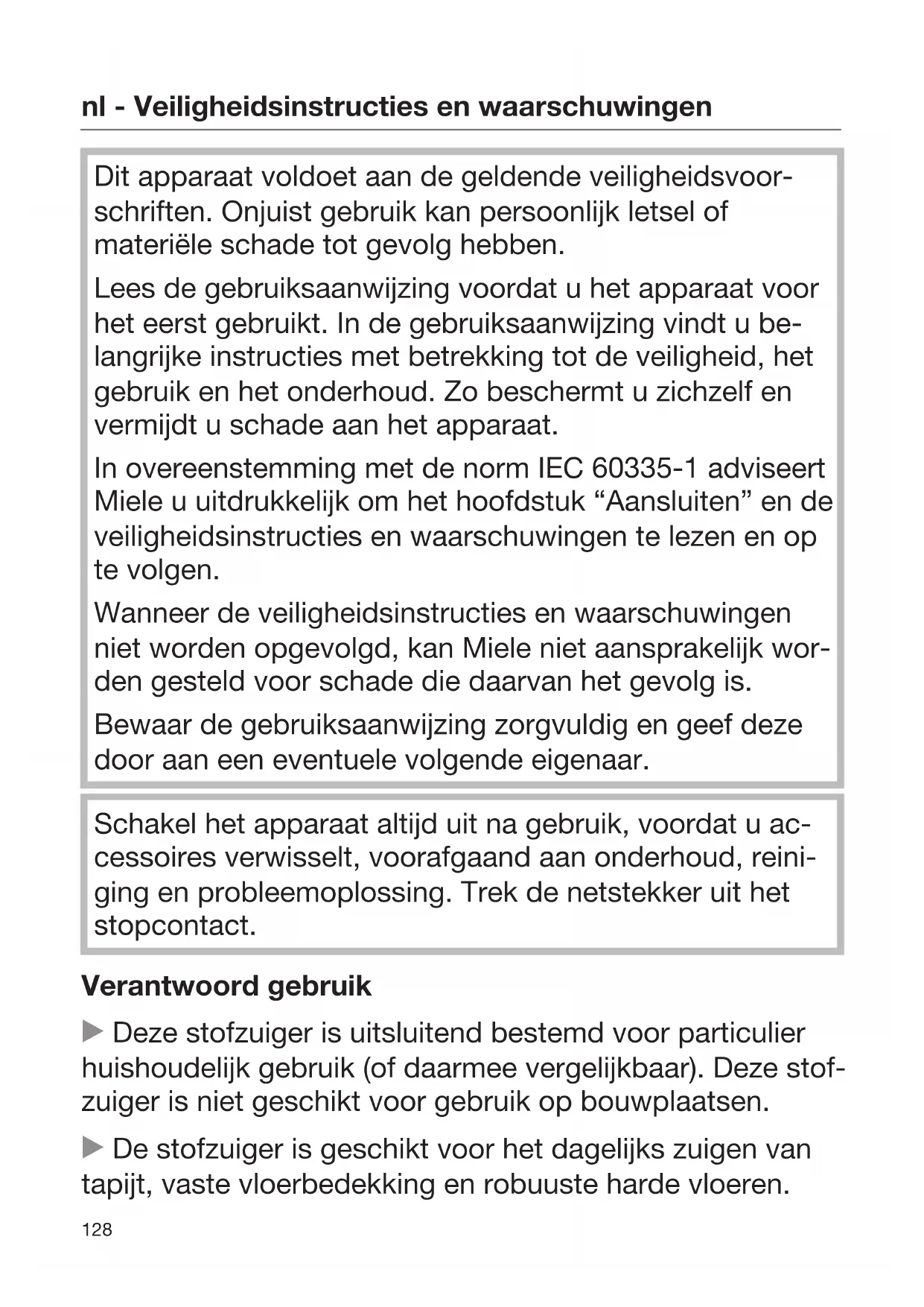 Dit apparaat voldoet aan de geldende veiligheidsvoor- schriften. Onjuist gebruik kan persoonlijk letsel of materiële schade tot gevolg hebben. Lees de gebruiksaanwijzing voordat u het apparaat voor het eerst gebruikt. In de gebruiksaanwijzing vindt u be- langrijke instructies met betrekking tot de veiligheid, het gebruik en het onderhoud. Zo beschermt u zichzelf en vermijdt u schade aan het apparaat. In overeenstemming met de norm IEC60335-1 adviseert Miele u uitdrukkelijk om het hoofdstuk “Aansluiten” en de veiligheidsinstructies en waarschuwingen te lezen en op te volgen. Wanneer de veiligheidsinstructies en waarschuwingen niet worden opgevolgd, kan Miele niet aansprakelijk wor- den gesteld voor schade die daarvan het gevolg is. Bewaar de gebruiksaanwijzing zorgvuldig en geef deze door aan een eventuele volgende eigenaar. Schakel het apparaat altijd uit na gebruik, voordat u ac- cessoires verwisselt, voorafgaand aan onderhoud, reini- ging en probleemoplossing. Trek de netstekker uit het stopcontact. Verantwoord gebruik Deze stofzuiger is uitsluitend bestemd voor particulier huishoudelijk gebruik (of daarmee vergelijkbaar). Deze stof- zuiger is niet geschikt voor gebruik op bouwplaatsen. De stofzuiger is geschikt voor het dagelijks zuigen van tapijt, vaste vloerbedekking en robuuste harde vloeren.nl - Veiligheidsinstructies en waarschuwingen