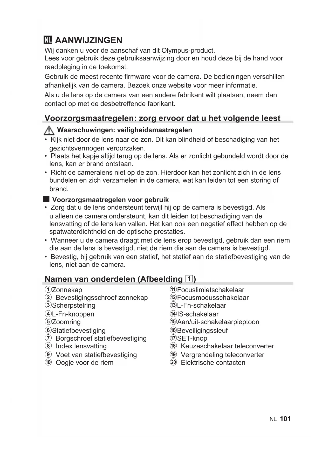 AANWIJZINGEN Wij danken u voor de aanschaf van dit Olympus-product. Lees voor gebruik deze gebruiksaanwijzing door en houd deze bij de hand voor raadpleging in de toekomst. Gebruik de meest recente firmware voor de camera. De bedieningen verschillen afhankelijk van de camera. Bezoek onze website voor meer informatie. Als u de lens op de camera van een andere fabrikant wilt plaatsen, neem dan contact op met de desbetreffende fabrikant. Voorzorgsmaatregelen: zorg ervoor dat u het volgende leest Waarschuwingen: veiligheidsmaatregelen