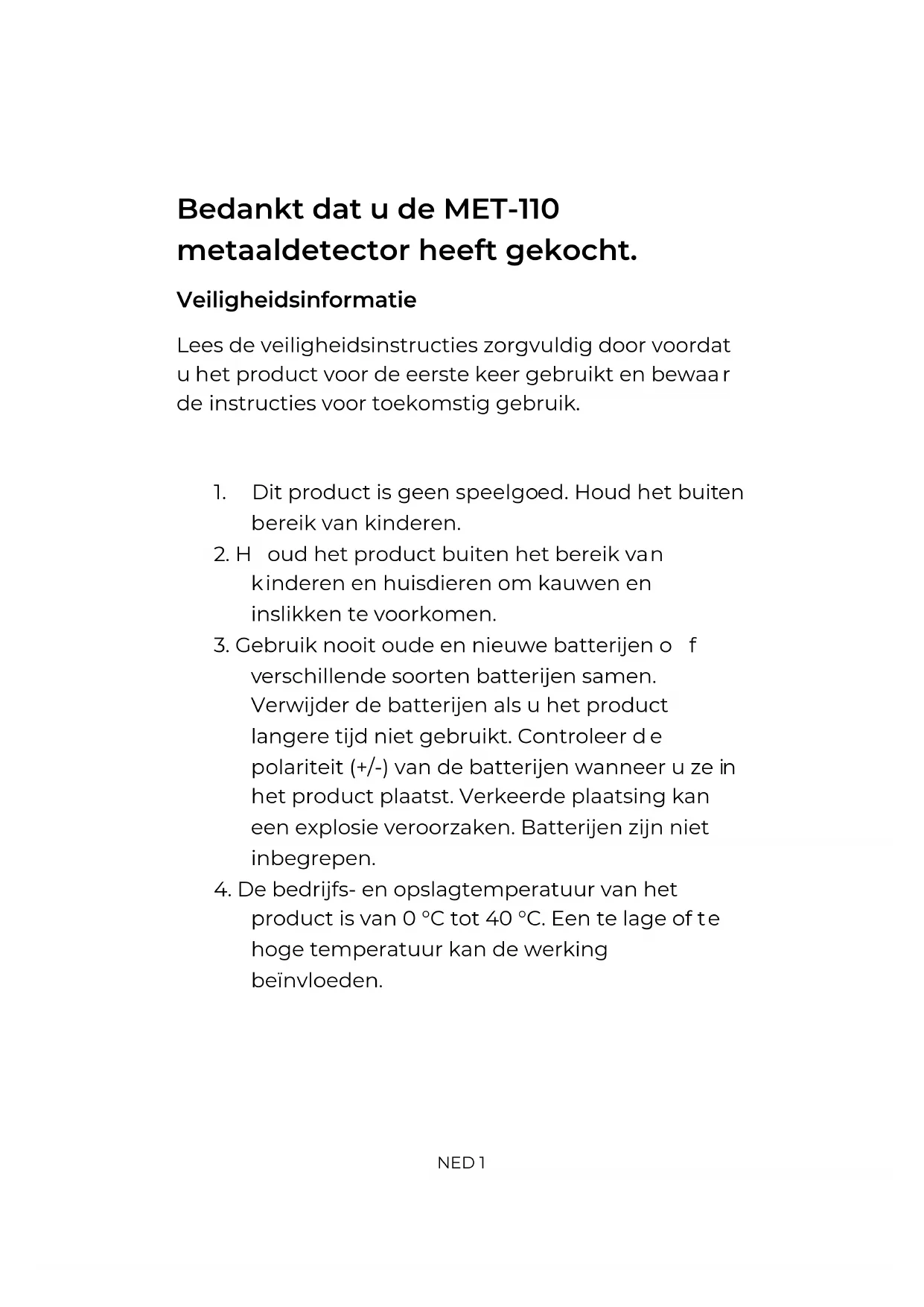 enver A/S Omega 5A, Soeften DK-8382 Hinnerup Danmark www.facebook.com/denver.euNED 1 Bedankt dat u de MET-110 metaaldetector heeft gekocht. Veiligheidsinformatie Lees de veiligheidsinstructies zorgvuldig door voordat