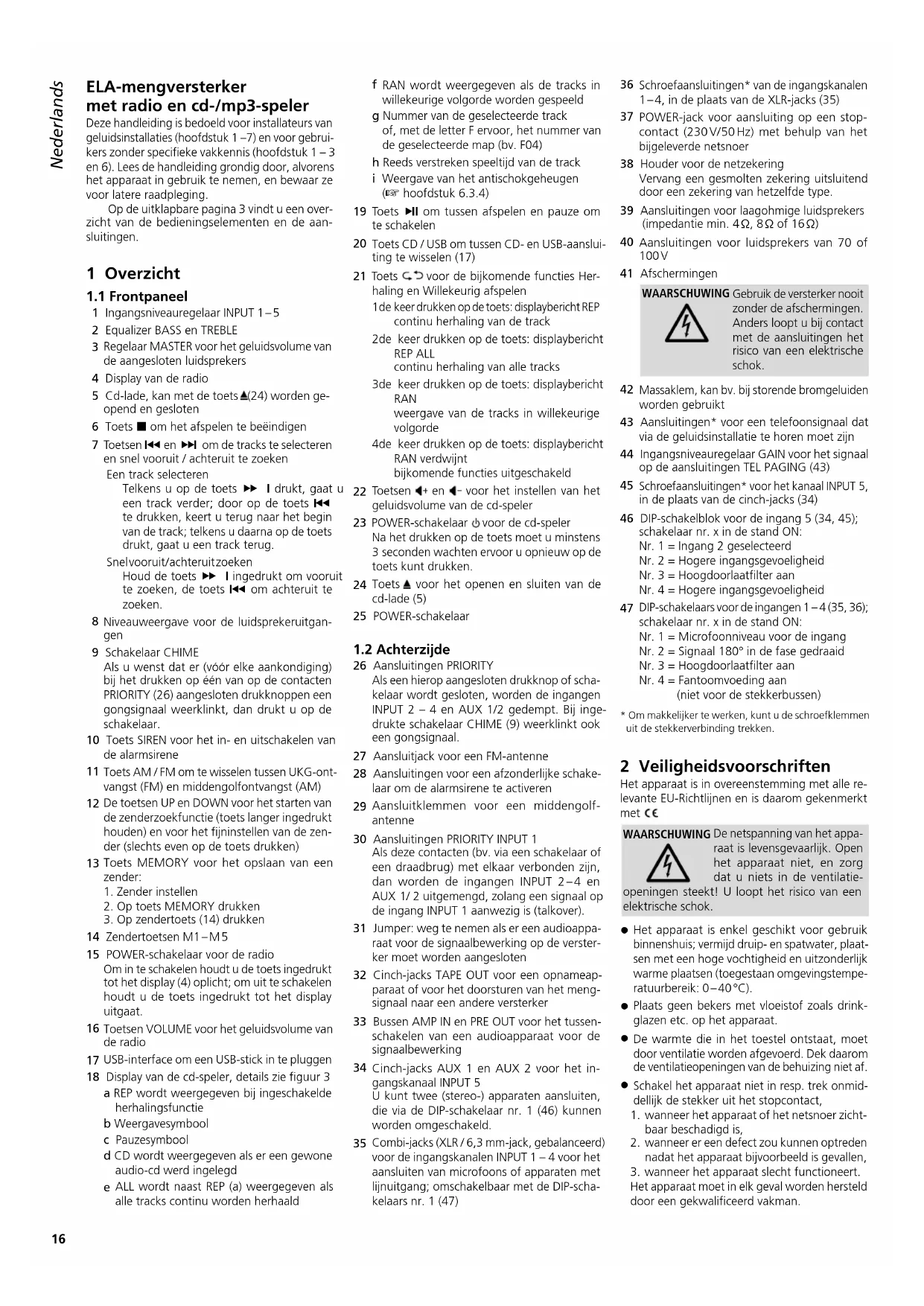 2) Meng de ingangssignalen met de regelaars INPUT 1 - 5 (1), het signaal van de radiomodule met de toetsen VOLUME (16) en het signaal van de cd-speler met de toetsen (2), of meng ze in en uit indien nodig. Zet het geluidsvolume van de niet-gebruikte kanalen steeds op nul.