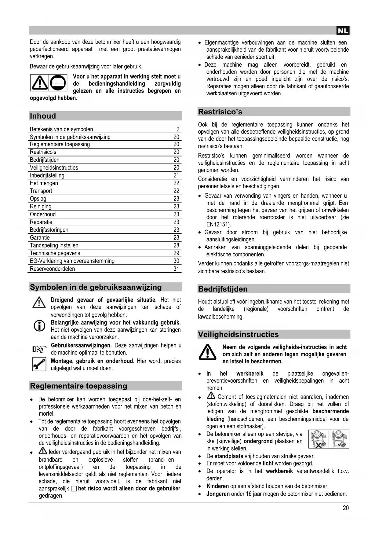 - De betonmixer alleen op een stevige, vla kke (kipveilige) ondergrund plaatsen en in werkung stellen.