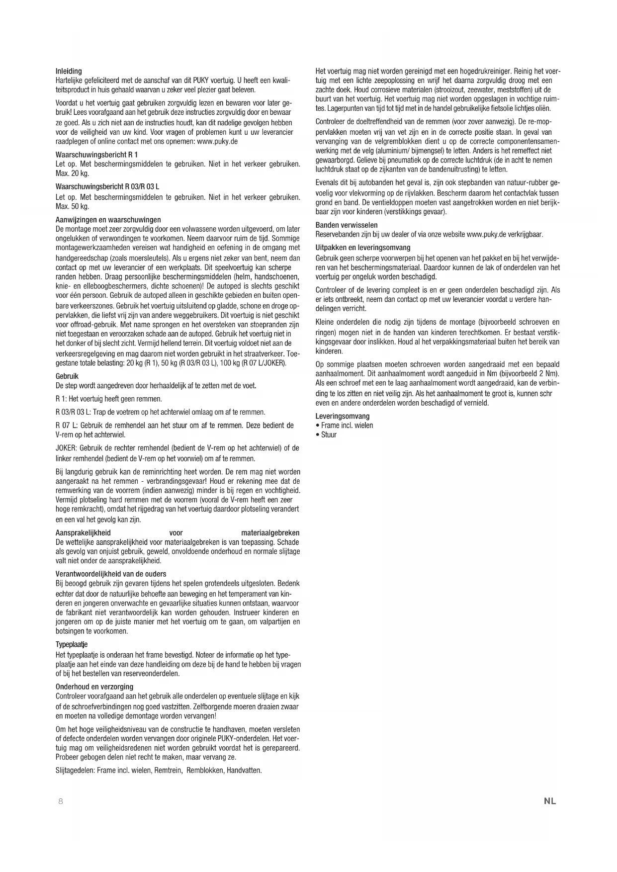 Voordat u het voertuig gaat gebruiken zorgvuldig lezen en bewaren voor later gebruik! Lees voorafaand aan het gebruik deze instructies zorgvuldig door en bewaar ze goed. Als u zich Niet aan de instructies houdt, kan dit nadelige gevolgen hebben voor de veilighheid van uw kind. Voor vragen of problemen kut u uw leverancier raadplegen of online contact met ons opnemen: www.puky.de
