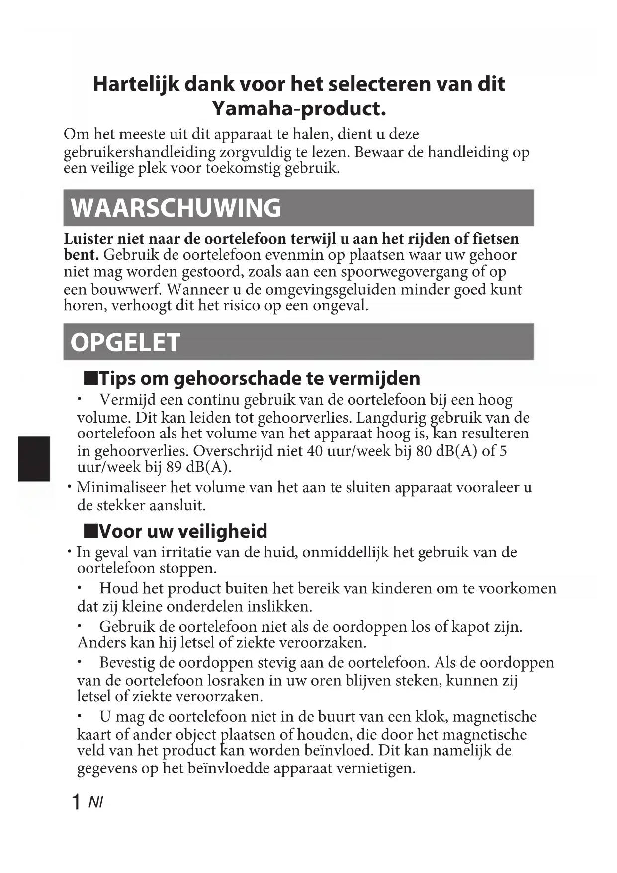 Hartelijk dank voor het selecteren van dit Yamaha-product. Om het meeste uit dit apparaat te halen, dient u deze gebruikershandleiding zorgvuldig te lezen. Bewaar de handleiding op een veilige plek voor toekomstig gebruik. WAARSCHUWING Luister niet naar de oortelefoon terwijl u aan het rijden of fietsen bent. Gebruik de oortelefoon evenmin op plaatsen waar uw gehoor niet mag worden gestoord, zoals aan een spoorwegovergang of op een bouwwerf. Wanneer u de omgevingsgeluiden minder goed kunt horen, verhoogt dit het risico op een ongeval. OPGELET ■ Tips om gehoorschade te vermijden x Vermijd een continu gebruik van de oortelefoon bij een hoog volume. Dit kan leiden tot gehoorverlies. Langdurig gebruik van de oortelefoon als het volume van het apparaat hoog is, kan resulteren in gehoorverlies. Overschrijd niet 40 uur/week bij 80 dB(A) of 5 uur/week bij 89 dB(A). x Minimaliseer het volume van het aan te sluiten apparaat vooraleer u de stekker aansluit. ■ Voor uw veiligheid x In geval van irritatie van de huid, onmiddellijk het gebruik van de oortelefoon stoppen. x Houd het product buiten het bereik van kinderen om te voorkomen dat zij kleine onderdelen inslikken. x Gebruik de oortelefoon niet als de oordoppen los of kapot zijn. Anders kan hij letsel of ziekte veroorzaken. x Bevestig de oordoppen stevig aan de oortelefoon. Als de oordoppen van de oortelefoon losraken in uw oren blijven steken, kunnen zij letsel of ziekte veroorzaken. x U mag de oortelefoon niet in de buurt van een klok, magnetische kaart of ander object plaatsen of houden, die door het magnetische veld van het product kan worden beïnvloed. Dit kan namelijk de gegevens op het beïnvloedde apparaat vernietigen.2