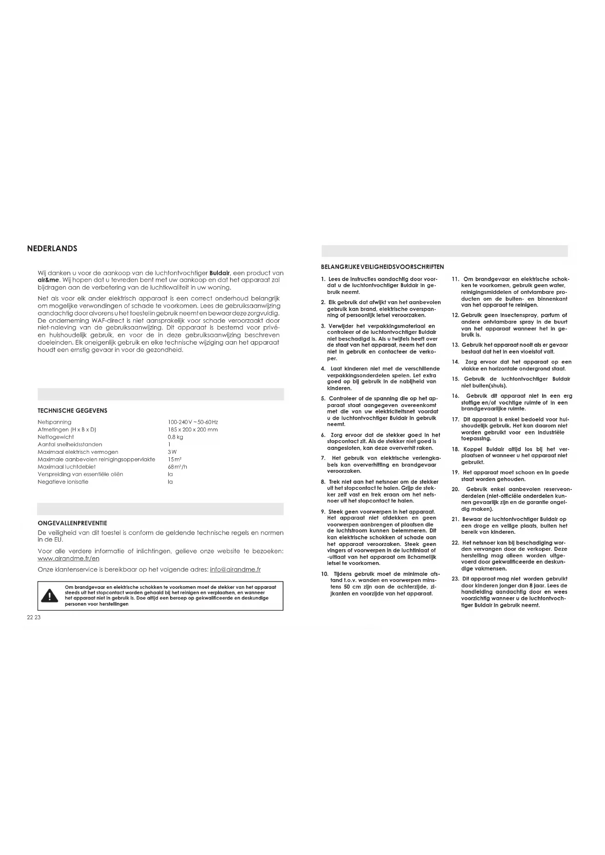door kinderen jonger dan 8 jaar. Lees de handleiding aandachtig door en wees voorzichtig wanneer u de luchtontvoch- tiger Buldair in gebruik neemt. BELANGRIJKE VEILIGHEIDSVOORSCHRIFTEN NEDERLANDS Om brandgevaar en elektrische schokken te voorkomen moet de stekker van het apparaat steeds uit het stopcontact worden gehaald bij het reinigen en verplaatsen, en wanneer het apparaat niet in gebruik is. Doe altijd een beroep op gekwaliceerde en deskundige personen voor herstellingen ONGEVALLENPREVENTIE De veiligheid van dit toestel is conform de geldende technische regels en normen in de EU. Voor alle verdere informatie of inlichtingen, gelieve onze website te bezoeken: www.airandme.fr/en Onze klantenservice is bereikbaar op het volgende adres: info@airandme.fr Wij danken u voor de aankoop van de luchtontvochtiger Buldair, een product van air&me. Wij hopen dat u tevreden bent met uw aankoop en dat het apparaat zal bijdragen aan de verbetering van de luchtkwaliteit in uw woning. Net als voor elk ander elektrisch apparaat is een correct onderhoud belangrijk om mogelijke verwondingen of schade te voorkomen. Lees de gebruiksaanwijzing aandachtig door alvorens u het toestel in gebruik neemt en bewaar deze zorgvuldig. De onderneming WAF-direct is niet aansprakelijk voor schade veroorzaakt door niet-naleving van de gebruiksaanwijzing. Dit apparaat is bestemd voor privé- en huishoudelijk gebruik, en voor de in deze gebruiksaanwijzing beschreven doeleinden. Elk oneigenlijk gebruik en elke technische wijziging aan het apparaat houdt een ernstig gevaar in voor de gezondheid. Netspanning Afmetingen (H x B x D) Nettogewicht Aantal snelheidsstanden Maximaal elektrisch vermogen Maximale aanbevolen reinigingsoppervlakte Maximaal luchtdebiet Verspreiding van essentiële oliën Negatieve ionisatie TECHNISCHE GEGEVENS 100-240 V ~ 50-60 Hz 185 x 200 x 200 mm 0,8 kg