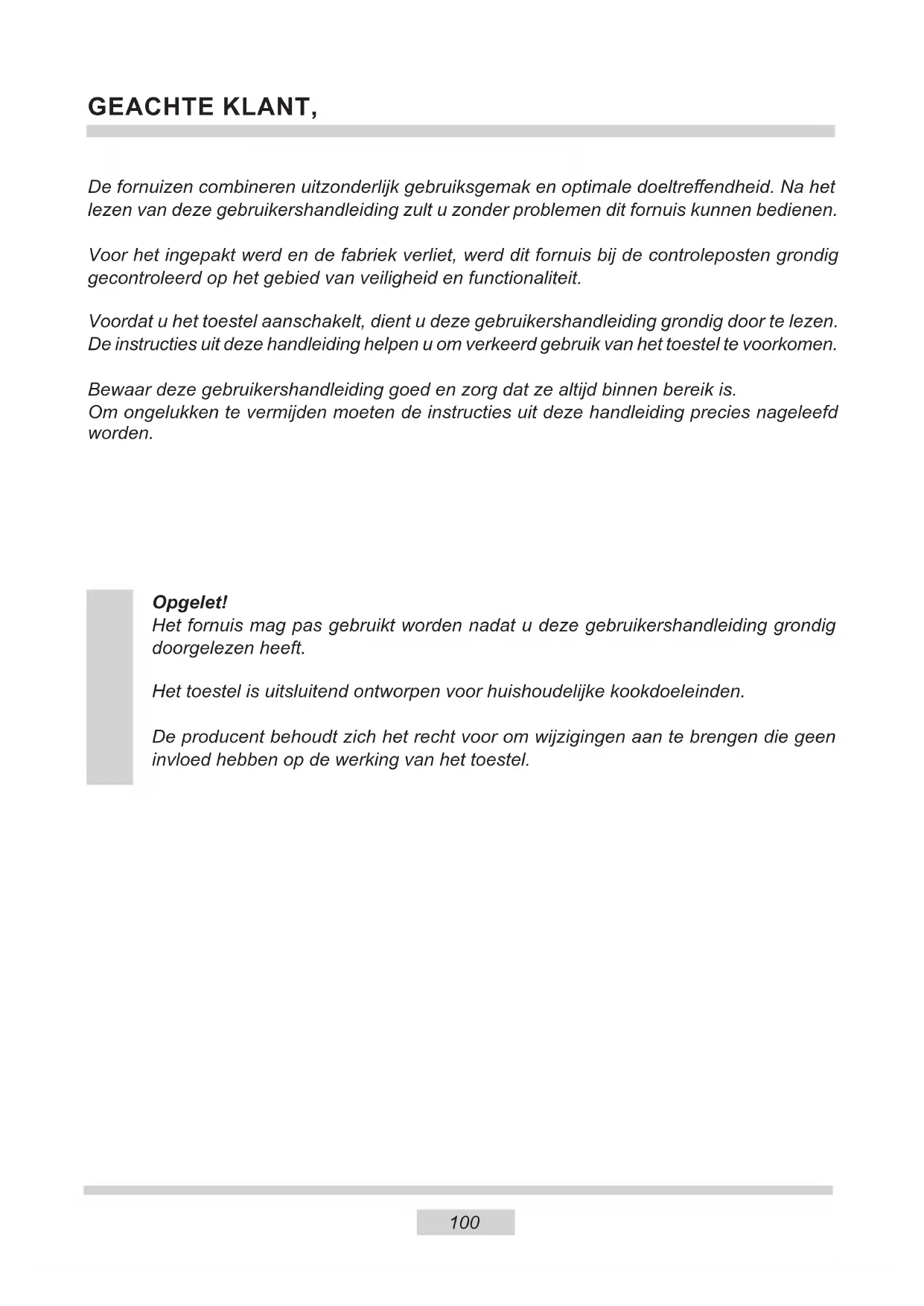 not work REASON ame openings soiled break in power supply break in gas supply soiled (greasy) gas ignitor knob not pressed in long enough knob released too quickly break in power supply the bulb is loose or dama- ged ACTION close the gas by cutting o valve, close burner knobs, air the room, take out and clean the burner, blow on ame openings check the household fuse box; if there is a blown fuse, replace it with a new one open the gas supply valve clean the gas ignitor hold the knob pressed in until a full ame appears around the burner crown hold the knob down longer at the “large ame” position check the household fuse box, if there is a blown fuse replace it with a new one tighten up or replace the blown bulb (see Chapter Cleaning and Maintenance)99 Voltage rating 230V~50 Hz Power rating max. 2,0 kW Appliance category DE II2ELL3B/P, NL II2L3B/P, AT II2H3B/P BE II2E+3+, SI II2H3+ CZ,SK,BG, HR, RO II2H3B/P Cooker dimensions H/W/D 85/50/60 cm Complies with EU regulations EN-30-1-1, EN 60335-1, EN 60335-2-6 standards TECHNICAL DATA Certicate of compliance CE The Manufacturer hereby declares that this product complies with the general requirements pursuant to the following European Directives: The Low Voltage Directive 2014/35/EC, Electromagnetic Compatibility Directive 2014/30/EC, Directive on “Appliances Burning Gaseous Fuels” 2009/142/EC, (to 20.04.2018) Regulation (EU) 2016/426 of the European Parliament and of the Council (from 21.04.2018) Directive on ErP 2009/125/EC, and therefore the product has been marked with the symbol and the Declaration of Conformity has been issued to the manufacturer and is available to the competent authorities regulating the market.100 GEACHTE KLANT, De fornuizen combineren uitzonderlijk gebruiksgemak en optimale doeltreendheid. Na het lezen van deze gebruikershandleiding zult u zonder problemen dit fornuis kunnen bedienen. Voor het ingepakt werd en de fabriek verliet, werd dit fornuis bij de controleposten grondig gecontroleerd op het gebied van veiligheid en functionaliteit. Voordat u het toestel aanschakelt, dient u deze gebruikershandleiding grondig door te lezen. De instructies uit deze handleiding helpen u om verkeerd gebruik van het toestel te voorkomen. Bewaar deze gebruikershandleiding goed en zorg dat ze altijd binnen bereik is. Om ongelukken te vermijden moeten de instructies uit deze handleiding precies nageleefd worden. Opgelet! Het fornuis mag pas gebruikt worden nadat u deze gebruikershandleiding grondig doorgelezen heeft. Het toestel is uitsluitend ontworpen voor huishoudelijke kookdoeleinden. De producent behoudt zich het recht voor om wijzigingen aan te brengen die geen invloed hebben op de werking van het toestel. NL101 VEILIGHEIDSINSTRUCTIES Attentie. Dit apparaat en de bereikbare onderdelen ervan worden tijdens het gebruik heet. Wees bijzonder voorzich- tig bij het aanraken van de verwarmingselementen. Zorg dat kinderen die jonger zijn dan 8 jaar niet bij het apparaat kunnen komen, tenzij ze onder permanent toezicht staan. Dit apparaat mag gebruikt worden door kinderen van 8 jaar en ouder en personen met lichamelijke of geestelijke beperkingen of personen zonder ervaring met of kennis van het apparaat, als dit gebruik plaatsvindt onder toezicht of in overeenstemming met de gebruiksaanwijzing van het apparaat, door personen die verantwoordelijk zijn voor hun veiligheid. Zorg ervoor dat kinderen niet met het apparaat kunnen spelen. Kinderen mogen de kookplaat niet zonder toezicht schoonmaken of onderhoudswerkzaamheden ver- richten. Attentie. Het koken van vetten of olie op de kookplaat zonder toezicht kan erg gevaarlijk zijn en leiden tot brand. Probeer het vuur NOOIT met water te blussen, maar schakel het apparaat uit en bedek de vlammen met een deksel of een niet-brandbare deken. Attentie. Brandgevaar: geen voorwerpen verzamelen op de kookoppervlakte. Tijdens het gebruik wordt het toestel heet. Wees voorzichtig en raak de hete onderdelen in de oven niet aan. Als dit apparaat gebruikt wordt, kunnen de bereikbare onder- delen heet worden. Laat geen kinderen bij de oven komen.102 VEILIGHEIDSINSTRUCTIES Attentie. Gebruik geen schurende schoonmaakmiddelen of scherpe metalen voorwerpen voor het schoonmaken van het glas van de deur, omdat deze krassen kunnen veroorzaken op het oppervlak. Dit kan leiden tot barsten van het glas. Attentie. Om elektrocutie te vermijden dient u het toestel uit te schakelen vooraleer u het lampje vervangt. Het is aan te raden het deksel te reinigen vooraleer u het opent. U laat het oppervlak van de kookplaat best eerst af- koelen voordat u het deksel sluit. Gebruik geen stoomreinigers voor het schoonmaken van het fornuis. Gevaar voor verbranding! Bij het openen van de ovendeur kan hete stoom ontsnappen. Wees voorzichtig met het ope- nen van de deur tijdens of na aoop van het koken. Buig u bij het openen niet over de deur. Vergeet niet dat stoom bij bepaalde temperaturen onzichtbaar kan zijn. Attentie. Het kookproces moet onder toezicht plaatsvinden. Kortdurend koken moet onder continu toezicht plaatsvinden. Attentie. Gebruik uitsluitend schermen voor de kookplaat die zijn ontworpen door de producent van het apparaat of die door de producent in de gebruiksaanwijzing worden aanbevolen. Het toepassen van ongeschikte schermen kan ongevallen veroorzaken.103 VEILIGHEIDSINSTRUCTIES Attentie: Het kook- en braadtoestel genereert warmte, vocht en verbrandingsproducten in de ruimte waarin het geïnstalleerd is. Zorg ervoor dat de keuken goed geventileerd is, vooral wanneer het toestel wordt gebruikt. Langdurig intensief gebruik kan extra ventilatie vereisen, zoals het verhogen van de capaciteit van de mechanische ventilatie, indien toegepast, of extra ventilatie om de verbrandingsproducten veilig naar buiten af te voeren zodat de luchtuitwisseling in de ruimte gewaarborgd blijft. Raadpleeg een specialist alvorens extra ventilatie te installeren. Attentie: Het toestel mag alleen gebruikt worden om te koken en te bakken