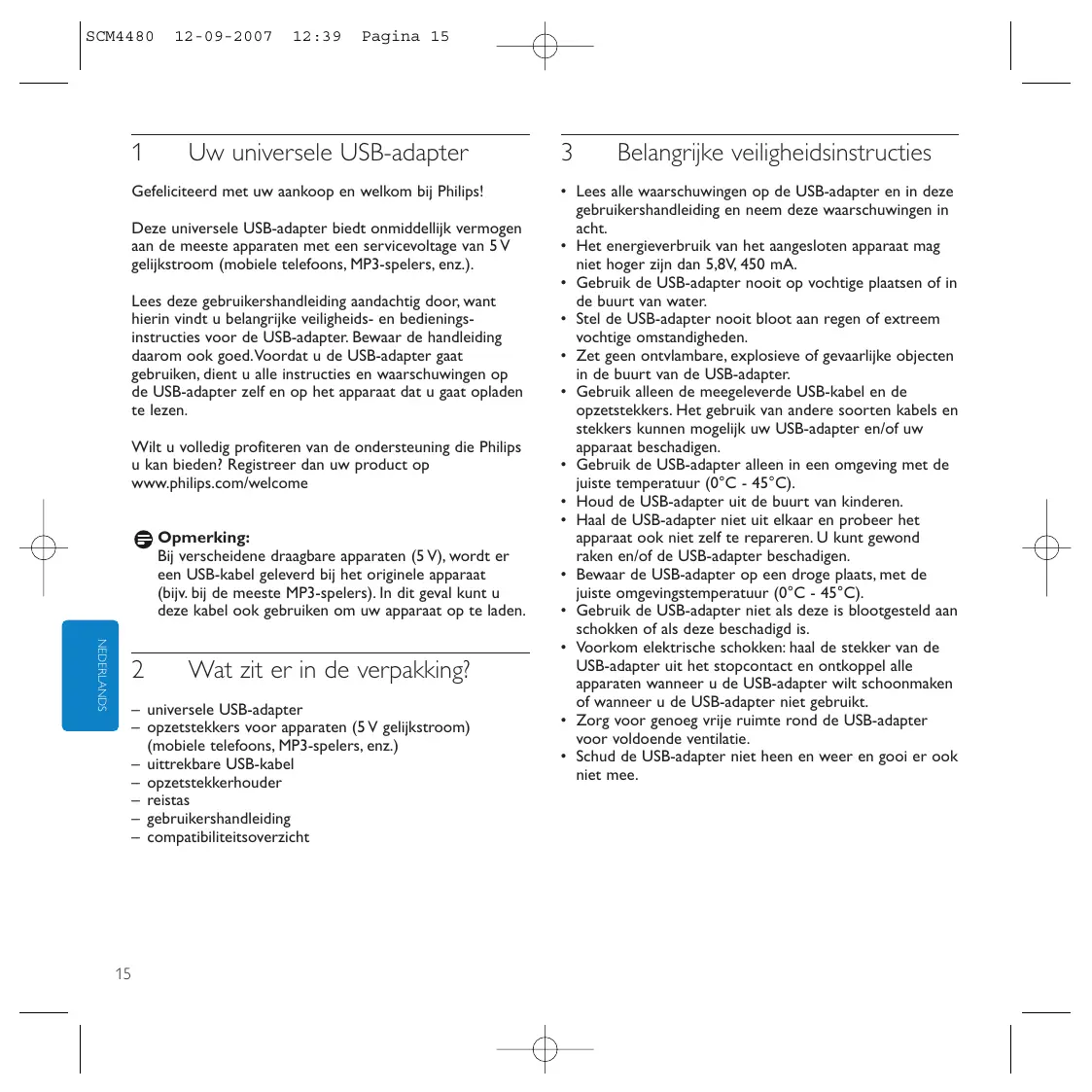 12-09-2007 12:39 Pagina 15 Uw universele USB-adapter Gefeliciteerd met uw aankoop en welkom bij Philips! Deze universele USB-adapter biedt onmiddellijk vermogen aan de meeste apparaten met een servicevoltage van 5 V gelijkstroom (mobiele telefoons, MP3-spelers, enz.). Lees deze gebruikershandleiding aandachtig door, want hierin vindt u belangrijke veiligheids- en bedieningsinstructies voor de USB-adapter. Bewaar de handleiding daarom ook goed.Voordat u de USB-adapter gaat gebruiken, dient u alle instructies en waarschuwingen op de USB-adapter zelf en op het apparaat dat u gaat opladen te lezen. Wilt u volledig profiteren van de ondersteuning die Philips u kan bieden? Registreer dan uw product op www.philips.com/welcome Opmerking: Bij verscheidene draagbare apparaten (5 V), wordt er een USB-kabel geleverd bij het originele apparaat (bijv. bij de meeste MP3-spelers). In dit geval kunt u deze kabel ook gebruiken om uw apparaat op te laden. NEDERLANDS