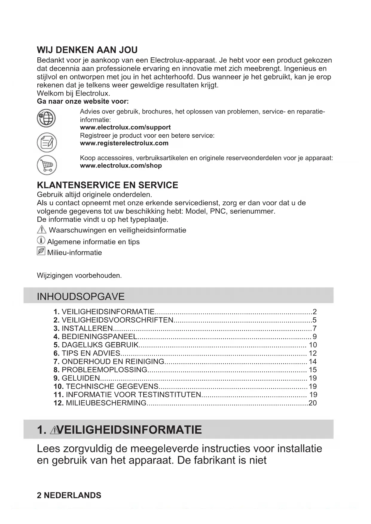 Gebruik altijd originele onderdelen.Als u contact opneemt met onze erkende servicedienst, zorg er dan voor dat u devolgende gegevens tot uw beschikking hebt: Model, PNC, serienummer.De informatie vindt u op het typeplaatje. Waarschuwingen en veiligheidsinformatie Algemene informatie en tips Milieu-informatieWijzigingen voorbehouden. INHOUDSOPGAVE