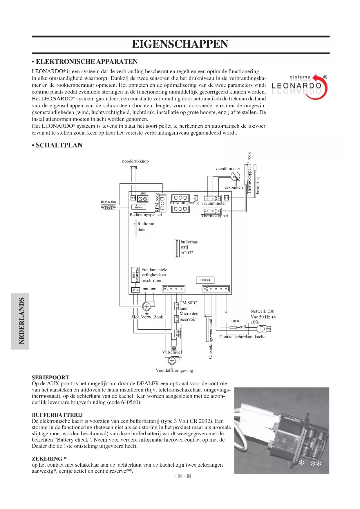 Radiomo- dule Fundamentele veiligheidsvo-orschriftenMicro deur reservoirRPM rookbesturing vacuümmeterleespuntenbufferbat-terijcr2032Mot. Verw. RookVentilatie omgevingVulschroefOntstekingsweerstandContact achterkant kachelBedieningspaneelThermokoppel T° rookTM 80°C tank vacuümmeterThermokoppelRPM omgevingNetwerk 230Vac 50 Hz +/- 10% nooddrukknop- 85 -- 85 - NEDERLANDS EIGENSCHAPPEN NB: