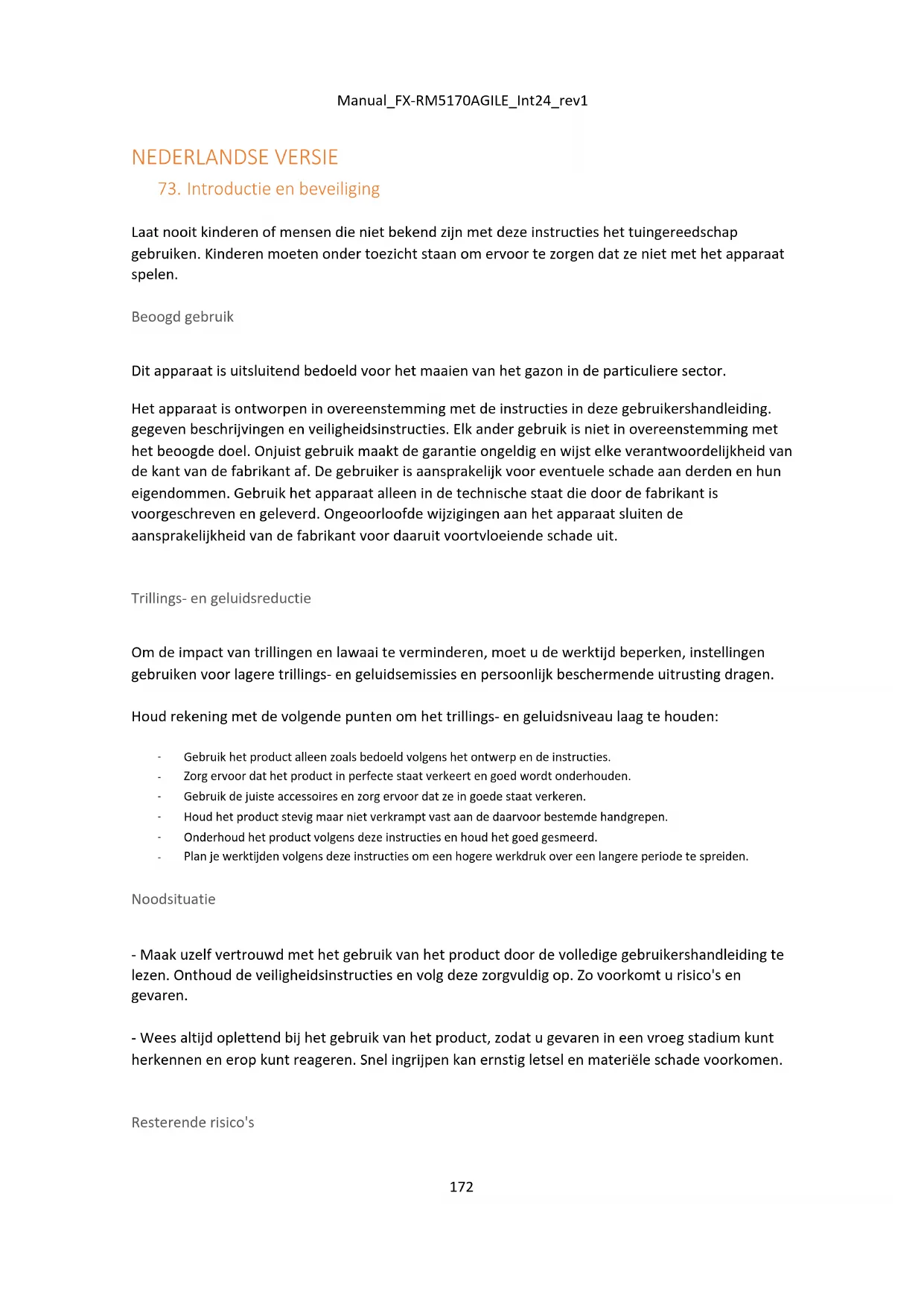 Algemene veiligheidsinstructies - Lees voor uw veiligheid en die van anderen deze gebruiksaanwijzing en de bijbehorende veiligheidsinstructies voordat u het apparaat gebruikt. Bewaar a.u.b. de gebruiksaanwijzing en Bewaar hun veiligheidsinstructies veilig op voor later gebruik en beschouw ze als elk inzetstuk bij de hand. - Geef de gebruiksaanwijzing door in geval van verandering van eigendom met het apparaat. - Personen die het apparaat bedienen, mogen niet onder invloed zijn van bedwelmende middelen (bijv. alcohol, drugs of medicijnen). - Gebruik het apparaat alleen op de door de fabrikant voorgeschreven en geleverde wijze technische staat. Ongeoorloofde wijzigingen aan het apparaat sluiten de aansprakelijkheid van de fabrikant voor daaruit voortvloeiende schade uit. - Gebruik het apparaat alleen bij daglicht of bij goed kunstlicht. - Gebruik het apparaat alleen bij droog weer. Houd het uit de buurt van regen of nat. Het binnendringen van water in het apparaat verhoogt het risico op elektrische schokken. - Schakel het apparaat uit en verwijder de batterij als u aan de volgende voorwaarden voldoet: ⬧ als het apparaat onbeheerd wordt achtergelaten; ⬧ als het apparaat overmatig begint te trillen. Voor gebruik - Voordat u met de werkzaamheden begint, moet u zich vertrouwd maken met het apparaat, de functies en de bedieningselementen. - Controleer het apparaat op tekenen van slijtage of beschadiging voordat u het gebruikt en na een botsing. - Gebruik geen apparaat waarvan de schakelaar defect is en niet meer kan worden in- of uitgeschakeld.Manual_FX-RM5170AGILE_Int24_rev1