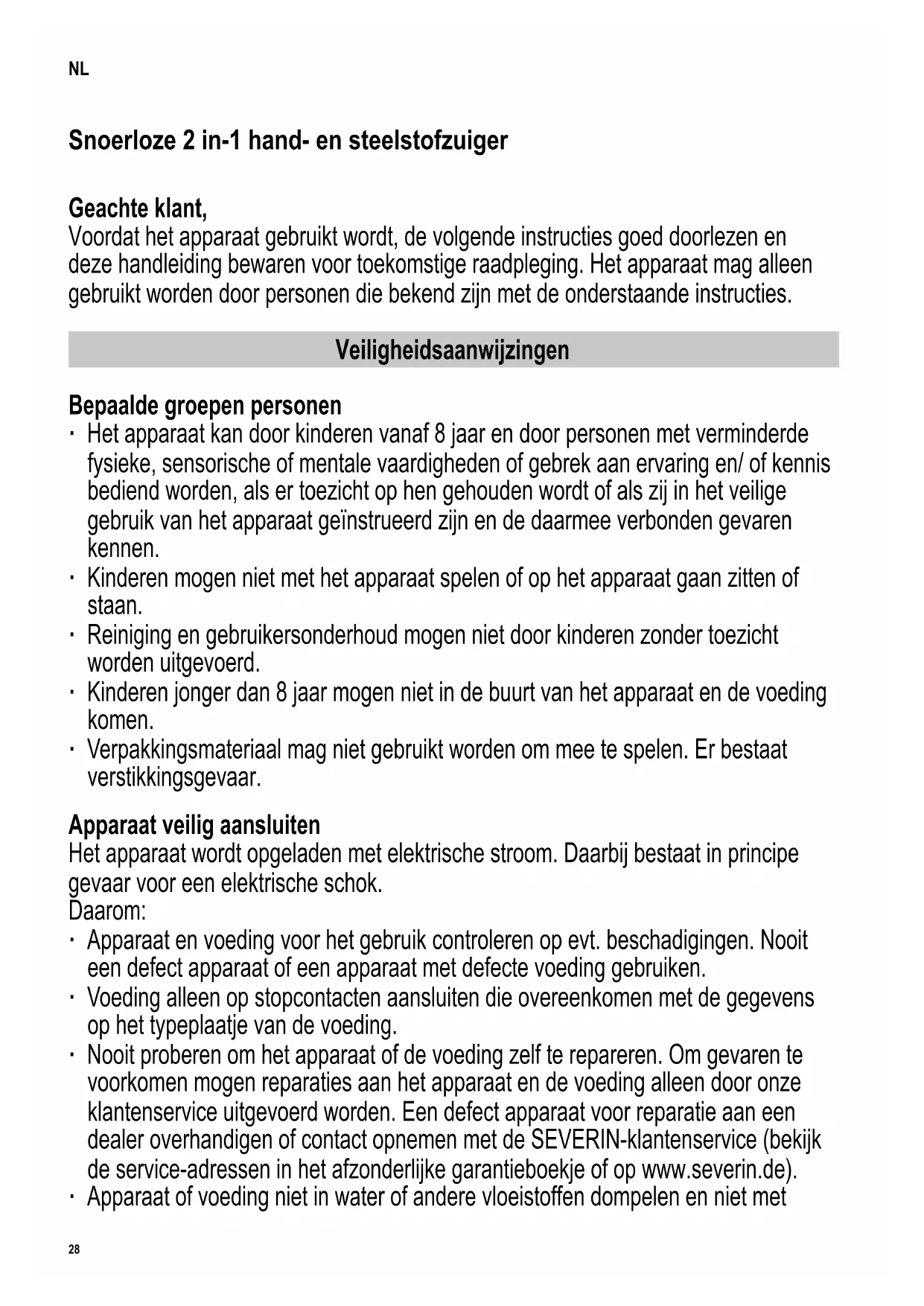 142 x 208 mm CONSEIL : n’utilisez pas de détergent agressif ou abrasif ni de brosses dures pour le nettoyage. Rangement de l’appareil ∙ Rangez l’appareil et les accessoires au frais, au sec et hors de portée des enfants. ∙ Pour faciliter le rangement, appuyez sur le bouton et rabattez la poignée. Numéro de commande Accessoires/pièces de rechange 9814-048 Ensemble ltre 6982-048 Bac à poussière avec ltre 2361-048 Bloc d’alimentation avec câble de raccordement 3709-048 Suceur pour aspirateur 3627-048 Brosse cylindrique pour brosse combinée 0024-048 Suceur plat court 9812-048 Long suceur plat 9811-048 Embout de brosse Résoudre les problèmes Résolution des pannes par l’utilisateur An d’éviter les pannes, il est important de vider régulièrement le réservoir à poussière, de contrôler à cette occasion l’état des ltres, et de les nettoyer si nécessaire. Cependant si vous avez des problèmes avec l’appareil, vériez avec le tableau ci-dessous, si vous ne pouvez pas résoudre le problème vous-même. Avant de procéder au dépannage, assurez-vous que l’appareil est éteint et n’est pas en charge. Problème Cause possible/solution La mise en marche de l’appareil est impossible. La batterie est complètement vide, la LED ne s’allume plus. Éteignez l’appareil et chargez la batterie. ►Chapitre « Chargement de la batterie » L’appareil ne se recharge pas (les LED ne clignotent pas). Le bloc de raccordement ou l’appareil n’est pas correctement branché. Vériez que l’adaptateur du bloc d’alimentation est correctement inséré dans le port de charge de l’appareil portatif. Vériez si le bloc d’alimentation est correctement inséré dans la prise secteur. En cas d’utilisation du port de charge à l’arrière de la poignée, vériez que la che est bien insérée dans le port de charge et que l’appareil portatif est bien enclenché. ►Chapitre « Chargement de la batterie » La batterie est pleine, mais l’appareil n’aspire presque pas de salissures. Videz le bac à poussière ou nettoyez le ltre. ►Chapitre « Nettoyage et entretien de l’appareil ». La durée de fonctionnement ne cesse de diminuer. La brosse est encrassée et doit être nettoyée, ►Chapitre « Nettoyage de la brosse ». Le ltre doit être nettoyé. ►Chapitre « Nettoyage et entretien de l’appareil ». La brosse cylindrique tourne lentement ou irréguliè rement. La brosse est encrassée et doit être nettoyée. ►Chapitre « Nettoyage de la brosse » Si ce tableau ne vous aide pas, contactez notre service d’assistance téléphonique (voir les coordonnées dans le livret de garantie séparé).27 142 x 208 mm Élimination Les appareils et batteries sur lesquels gurent ce symbole ne doivent pas être jetés avec les ordures ménagères. Ces appareils et batteries contiennent des matières premières précieuses, susceptibles d’être recyclées. Une mise au rebut conforme permet de contribuer à la protection de l’environnement et de la santé d’autrui. Mettez l’appareil et la batterie au rebut dans les points de collecte appropriés en vue de leur élimination. Votre mairie ou le magasin auprès duquel vous avez acquis l’appareil peuvent vous donner des informations y relatives.28 142 x 208 mm Snoerloze 2 in-1 hand- en steelstofzuiger Geachte klant, Voordat het apparaat gebruikt wordt, de volgende instructies goed doorlezen en deze handleiding bewaren voor toekomstige raadpleging. Het apparaat mag alleen gebruikt worden door personen die bekend zijn met de onderstaande instructies. Veiligheidsaanwijzingen Bepaalde groepen personen ∙ Het apparaat kan door kinderen vanaf 8 jaar en door personen met verminderde fysieke, sensorische of mentale vaardigheden of gebrek aan ervaring en/ of kennis bediend worden, als er toezicht op hen gehouden wordt of als zij in het veilige gebruik van het apparaat geïnstrueerd zijn en de daarmee verbonden gevaren kennen. ∙ Kinderen mogen niet met het apparaat spelen of op het apparaat gaan zitten of staan. ∙ Reiniging en gebruikersonderhoud mogen niet door kinderen zonder toezicht worden uitgevoerd. ∙ Kinderen jonger dan 8 jaar mogen niet in de buurt van het apparaat en de voeding komen. ∙ Verpakkingsmateriaal mag niet gebruikt worden om mee te spelen. Er bestaat verstikkingsgevaar. Apparaat veilig aansluiten Het apparaat wordt opgeladen met elektrische stroom. Daarbij bestaat in principe gevaar voor een elektrische schok. Daarom: ∙ Apparaat en voeding voor het gebruik controleren op evt. beschadigingen. Nooit een defect apparaat of een apparaat met defecte voeding gebruiken. ∙ Voeding alleen op stopcontacten aansluiten die overeenkomen met de gegevens op het typeplaatje van de voeding. ∙ Nooit proberen om het apparaat of de voeding zelf te repareren. Om gevaren te voorkomen mogen reparaties aan het apparaat en de voeding alleen door onze klantenservice uitgevoerd worden. Een defect apparaat voor reparatie aan een dealer overhandigen of contact opnemen met de SEVERIN-klantenservice (bekijk de service-adressen in het afzonderlijke garantieboekje of op www.severin.de). ∙ Apparaat of voeding niet in water of andere vloeistoffen dompelen en niet met NL29 142 x 208 mm vloeistoffen behandelen. Apparaat en voeding beschermen tegen regen en vocht. Apparaat en voeding niet gebruiken in de buitenlucht of ruimtes met hoge luchtvochtigheid. ∙ Apparaat en voeding niet met natte handen aanraken. Bij het uittrekken van de voeding uit het stopcontact altijd direct aan de voeding trekken. ∙ Erop letten dat de kabel van de voeding niet geknikt of ingeklemd raakt, dat er niet overheen wordt gereden en dat deze niet met hittebronnen, vocht of scherpe randen in aanraking komt. Erop letten dat de kabel van de voeding niet voor struikelgevaar zorgt. ∙ Voor het reinigen of onderhouden van het apparaat en voor het wisselen van toebehoren het apparaat uitschakelen en ervoor zorgen dat de voeding niet aangesloten is. 