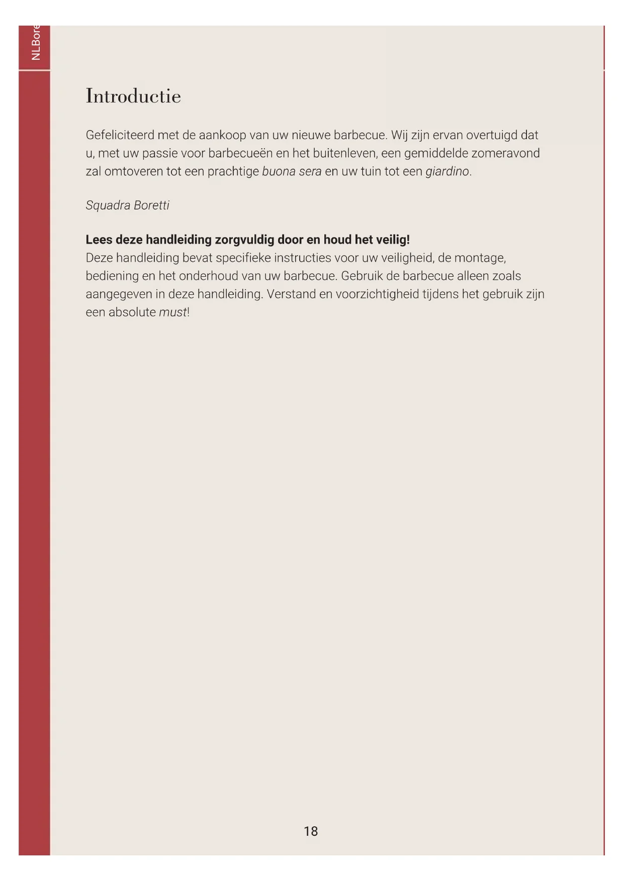 NL | GEBRUIKSAANWIJZING www.boretti.com18 NLBoretti Ceramica Compact/Gebruikershandleiding Introductie Gefeliciteerd met de aankoop van uw nieuwe barbecue. Wij zijn ervan overtuigd dat u, met uw passie voor barbecueën en het buitenleven, een gemiddelde zomeravond zal omtoveren tot een prachtige buona sera en uw tuin tot een giardino. Squadra Boretti Lees deze handleiding zorgvuldig door en houd het veilig! Deze handleiding bevat specifieke instructies voor uw veiligheid, de montage, bediening en het onderhoud van uw barbecue. Gebruik de barbecue alleen zoals aangegeven in deze handleiding. Verstand en voorzichtigheid tijdens het gebruik zijn een absolute must!18 19 NLBoretti Ceramica Compact/Gebruikershandleiding Belangrijke veiligheidsinformatie Lees deze handleiding zorgvuldig door en houd het veilig!