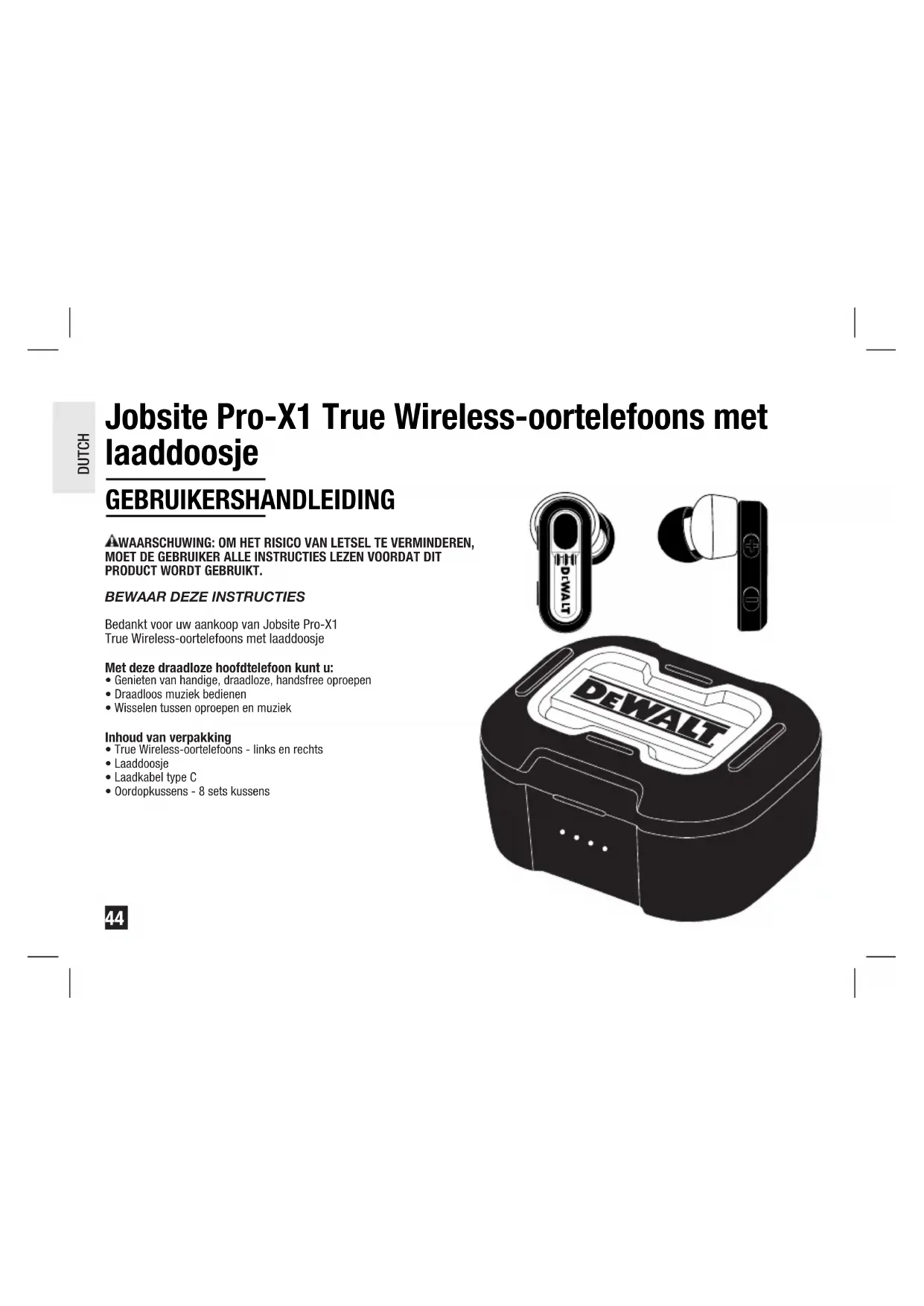 Bedankt voor uw aankoop van Jobsite Pro-X1 True Wireless-oortelefoons met laaddoosje Met deze draadloze hoofdtelefoon kunt u: