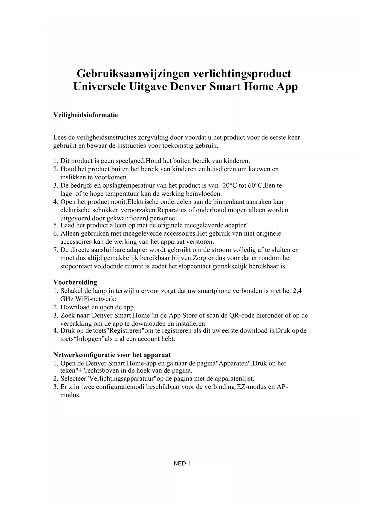 DEN-3Gebruiksaanwijzingen verlichtingsproduct Universele Uitgave Denver Smart Home App Veiligheidsinformatie Lees de veiligheidsinstructies zorgvuldig door voordat u het product voor de eerste keer gebruikt en bewaar de instructies voor toekomstig gebruik.