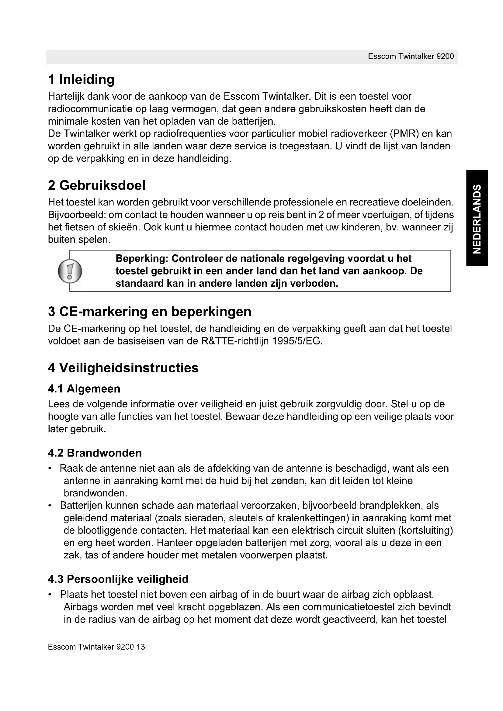 Hartelijk dank voor de aankoop van de Esscom Twintalker. Dit is een toestel voor radiocommunicatie op laag vermogen, dat geen andere gebruikskosten heeft dan de minimale kosten van het opladen van de batterijen.