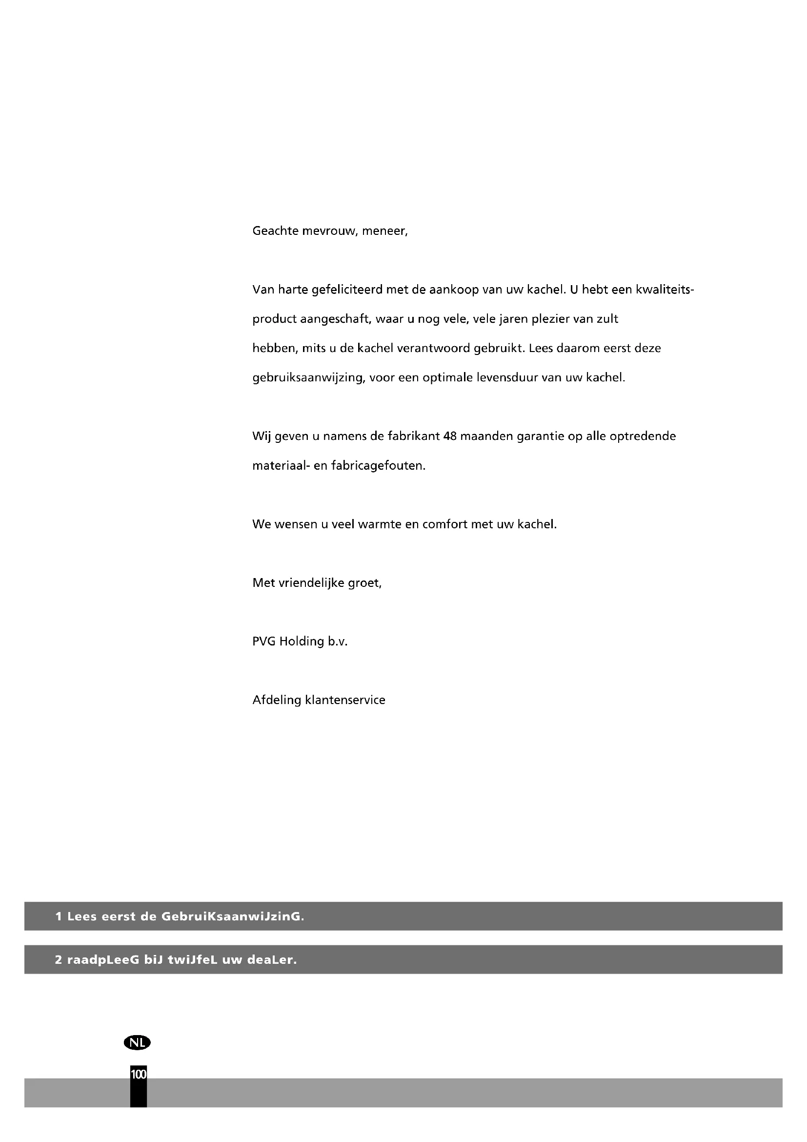 99Geachte mevrouw, meneer, Van harte gefeliciteerd met de aankoop van uw kachel. U hebt een kwaliteits- product aangeschaft, waar u nog vele, vele jaren plezier van zult hebben, mits u de kachel verantwoord gebruikt. Lees daarom eerst deze gebruiksaanwijzing, voor een optimale levensduur van uw kachel. Wij geven u namens de fabrikant 48 maanden garantie op alle optredende materiaal- en fabricagefouten. We wensen u veel warmte en comfort met uw kachel. Met vriendelijke groet, PVG Holding b.v. Afdeling klantenservice 1 Lees eerst de GebruiksaanwiJzinG. 2 raadpLeeG biJ twiJfeL uw deaLer.