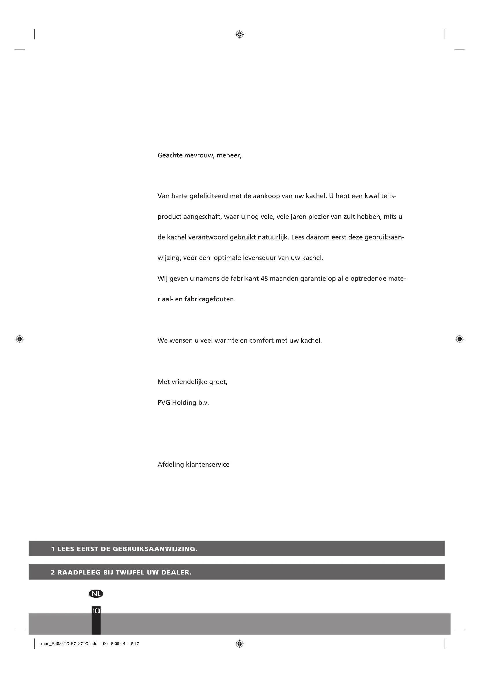 Geachtemevrouw,meneer, Vanhartegefeliciteerdmetdeaankoopvanuwkachel.Uhebteenkwaliteits- productaangeschaft,waarunogvele,velejarenpleziervanzulthebben,mitsu dekachelverantwoordgebruiktnatuurlijk.Leesdaaromeerstdezegebruiksaan- wijzing,vooreenoptimalelevensduurvanuwkachel. Wijgevenunamensdefabrikant48maandengarantieopalleoptredendemate- riaal-enfabricagefouten. Wewensenuveelwarmteencomfortmetuwkachel. Metvriendelijkegroet, PVGHoldingb.v. Afdelingklantenservice