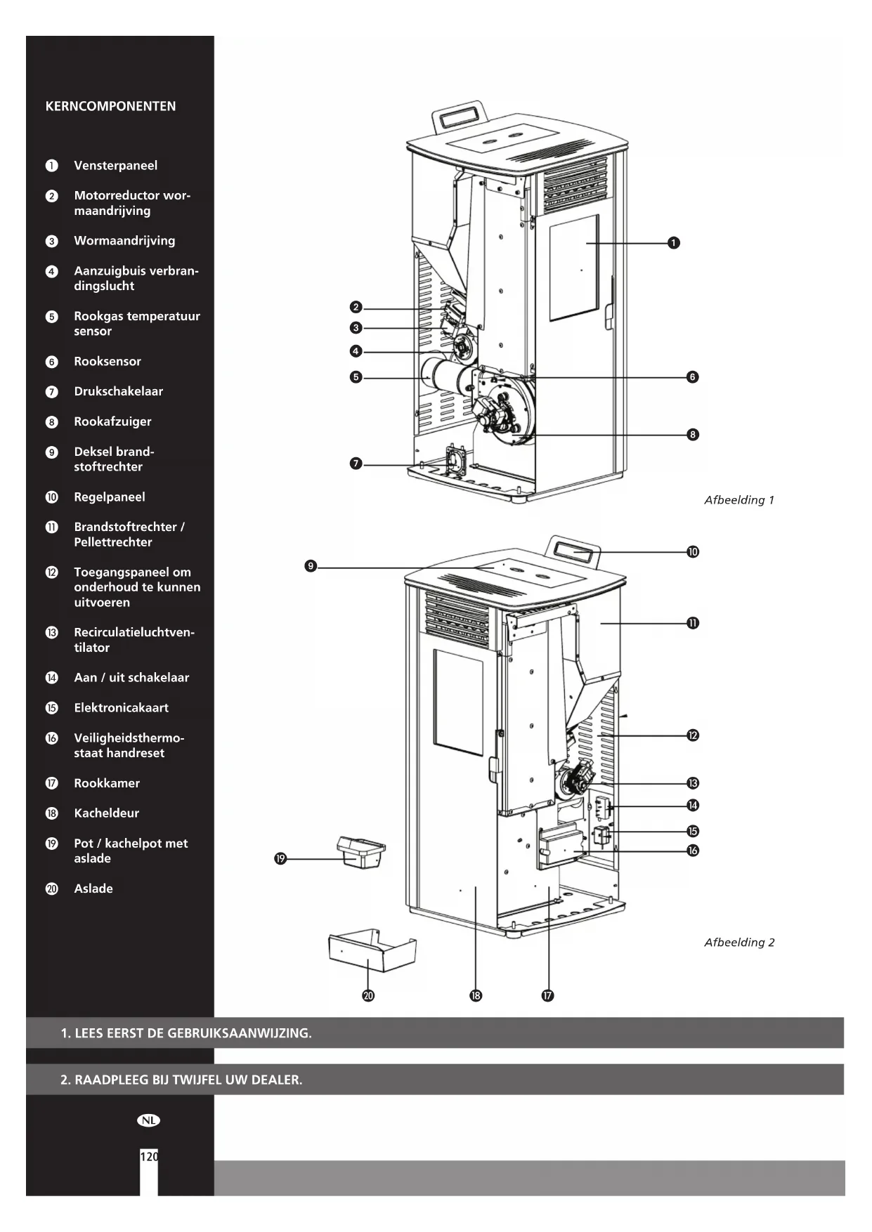 KERNCOMPONENTEN Vensterpaneel Motorreductor wor- maandrijving Wormaandrijving Aanzuigbuis verbran- dingslucht Rookgas temperatuur sensor Rooksensor Drukschakelaar Rookafzuiger Deksel brand- stoftrechter Regelpaneel Brandstoftrechter / Pellettrechter Toegangspaneel om onderhoud te kunnen uitvoeren Recirculatieluchtven- tilator Aan / uit schakelaar Elektronicakaart Veiligheidsthermo- staat handreset Rookkamer Kacheldeur Pot / kachelpot met aslade Aslade Afbeelding 2 Afbeelding 1