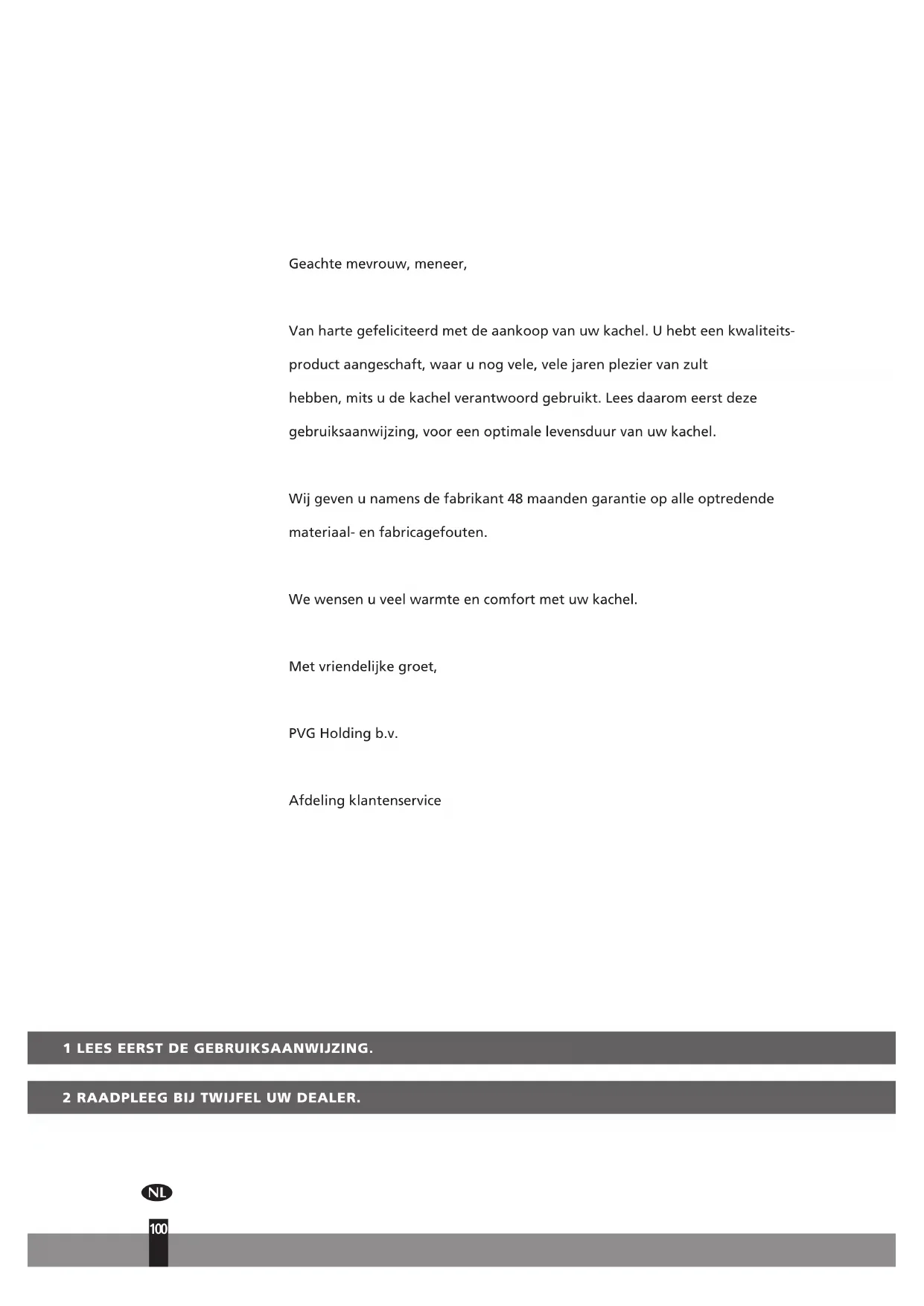 99Geachte mevrouw, meneer, Van harte gefeliciteerd met de aankoop van uw kachel. U hebt een kwaliteits- product aangeschaft, waar u nog vele, vele jaren plezier van zult hebben, mits u de kachel verantwoord gebruikt. Lees daarom eerst deze gebruiksaanwijzing, voor een optimale levensduur van uw kachel. Wij geven u namens de fabrikant 48 maanden garantie op alle optredende materiaal- en fabricagefouten. We wensen u veel warmte en comfort met uw kachel. Met vriendelijke groet, PVG Holding b.v. Afdeling klantenservice 1 LEES EERST DE GEBRUIKSAANWIJZING. 2 RAADPLEEG BIJ TWIJFEL UW DEALER.