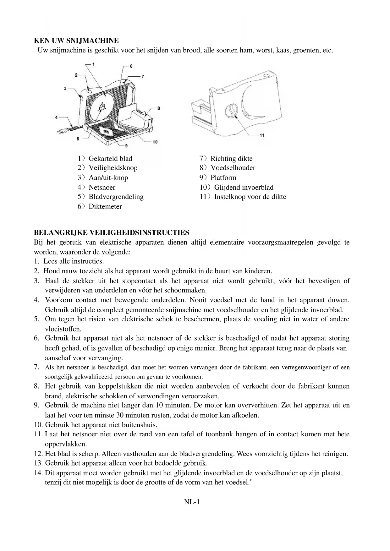 tenzij dit niet mogelijk is door de grootte of de vorm van het voedsel." NL-1 1)Gekarteld blad 2)Veiligheidsknop 3)Aan/uit-knop 4)Netsnoer 5)Bladvergrendeling 6)Diktemeter 7)Richting dikte 8)Voedselhouder 9)Platform 10)Glijdend invoerblad 11)Instelknop voor de dikte15. Zet het apparaat uit voor het veranderen van accessoires of het benaderen van onderdelen die bewegen tijdens gebruik.