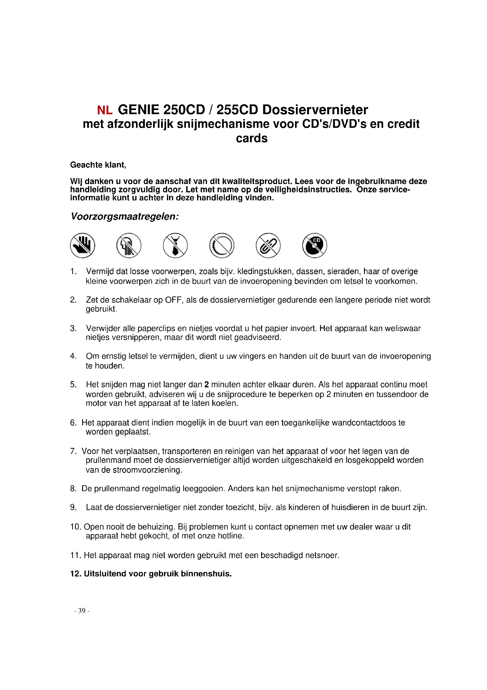 Dit apparaat voldoet aan de vereisten conform EU-Richtlijn 89/336/EWG betreffende "Elektromagnetische compatibiliteit en 73/23/EWG betreffende "Laagspanningsrichtlijn".- 43 - VAS GENIE 250CD / 255CD documentenvernietiger met apart snijdmechanisme voor cd’s / dvd’s en kredietkaarten Geachte klant, Wij danken u voor de aankoop van dit kwaliteitsproduct. Gelieve deze gebruiksaanwijzing voor het allereerste gebruik zorgvuldig door te lezen. Let vooral op de veiligheidsaanwijzingen. Onze service-informatie vindt u aan het einde van deze gebruiksaanleiding. Voorzorgsmaatregelen