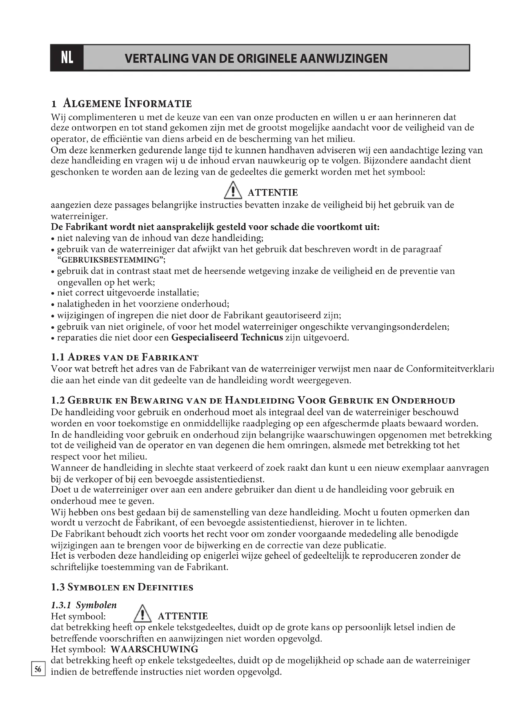 De handleiding voor gebruik en onderhoud moet als integraal deel van de waterreiniger beschouwd worden en voor toekomstige en onmiddelijkke raadpleging op een afgeschermde plaats bewaard worden. In de handleiding voor gebruik en onderhoud zijn belangrijke waarschuwingen opgenomen met betrekking tot de veriligheid van de operator en van degenen die hem omringen, alsmede met betrekking tot het respect voor het milieu.